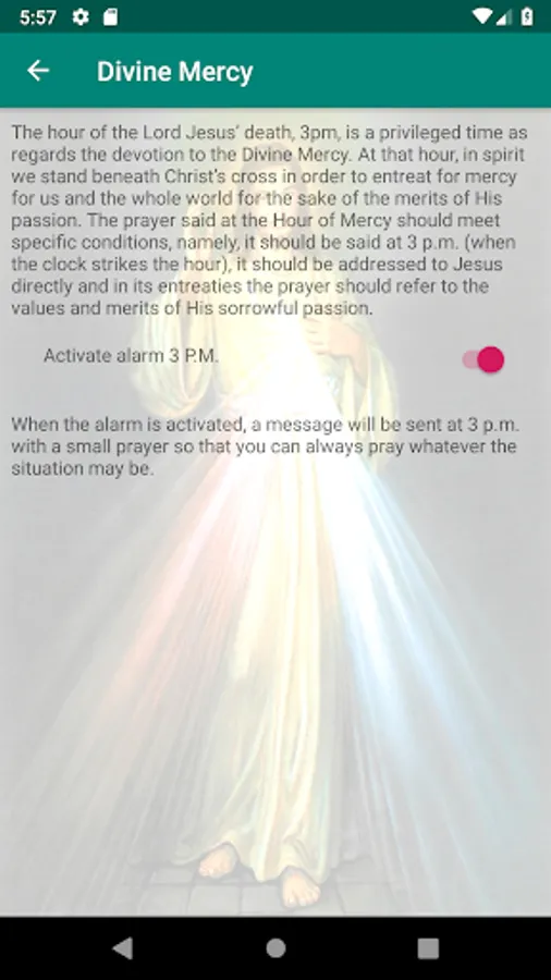 The Divine Mercy is the revelation made by Jesus to Saint Mary Faustina Kowalska in which she reveals the great and profound of her mercy. In this application you will find the Chaplet of Divine Mercy, the novena prayer and three in the afternoon with their respective alarm.