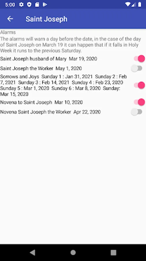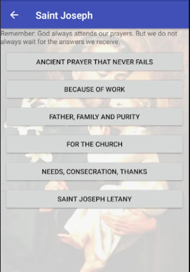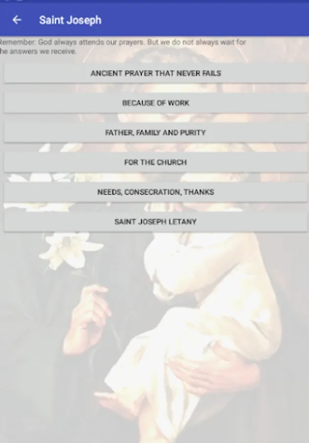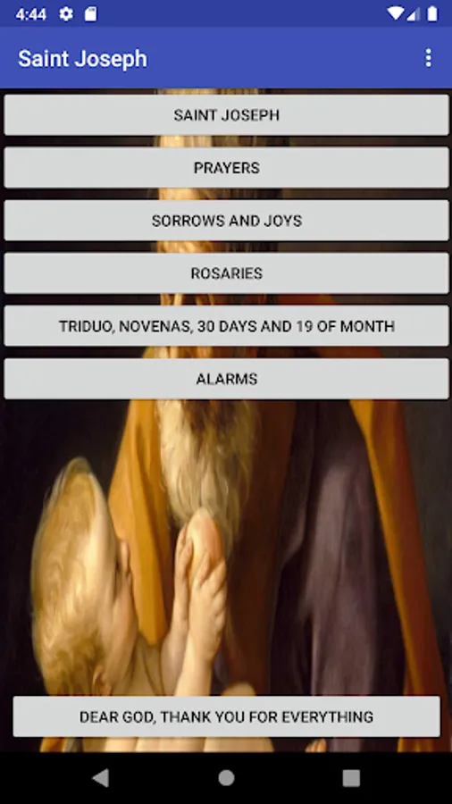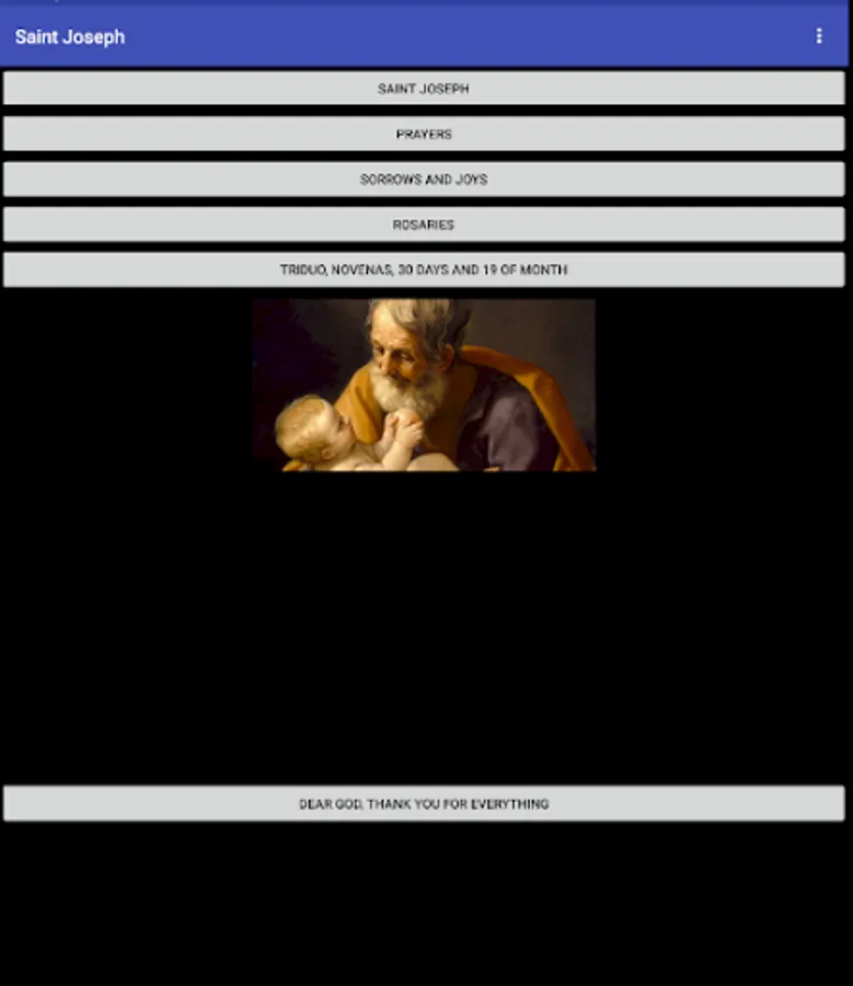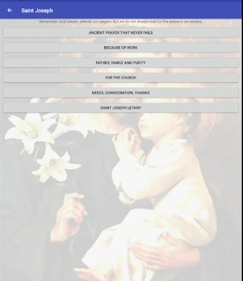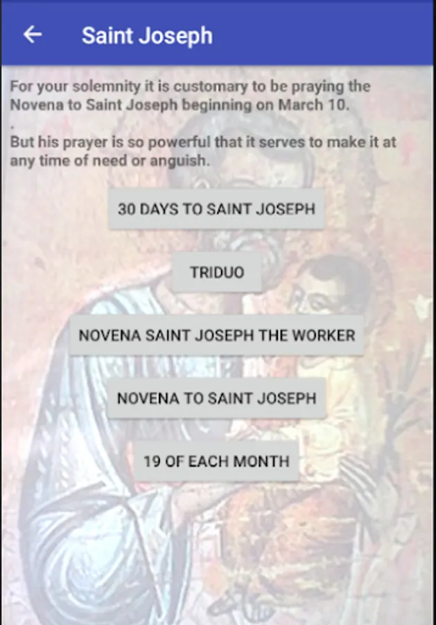 This is a set of prayers to St. Joseph, both simple prayers and novenas rosaries, triduum, pains and joys, for various needs from getting a job to being a good parent, with alarms to warn the special days of celebration or prayer, without However it is not even less complete, it may be that the translations are wrong so I would appreciate any correction or request for the addition of any sentence.