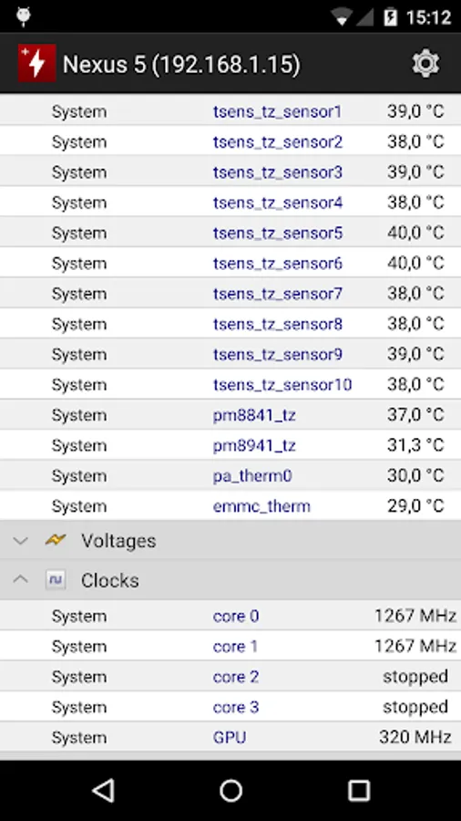 HWMonitor PRO is a health monitoring program dedicated to Android devices. It shows in real time a various set of temperatures (depending on device), battery information (voltage, temperature and charge level), and CPU utilization.