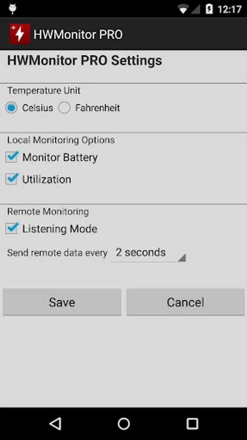 - Android : install HWMonitor PRO for Android on the device that you want to follow up, then click on the local monitor (1st entry) to start monitoring. Make sure that listening mode is checked in the settings page. Note the machine name and IP.