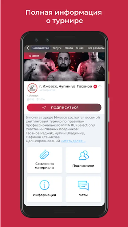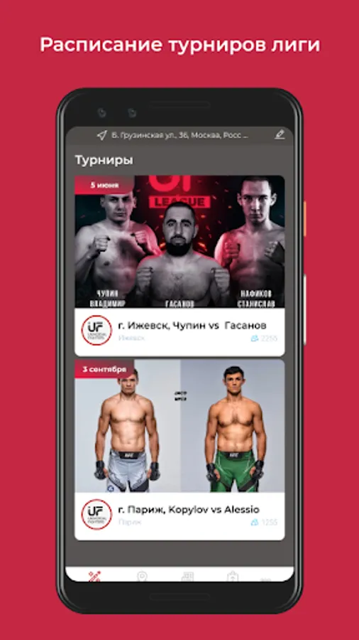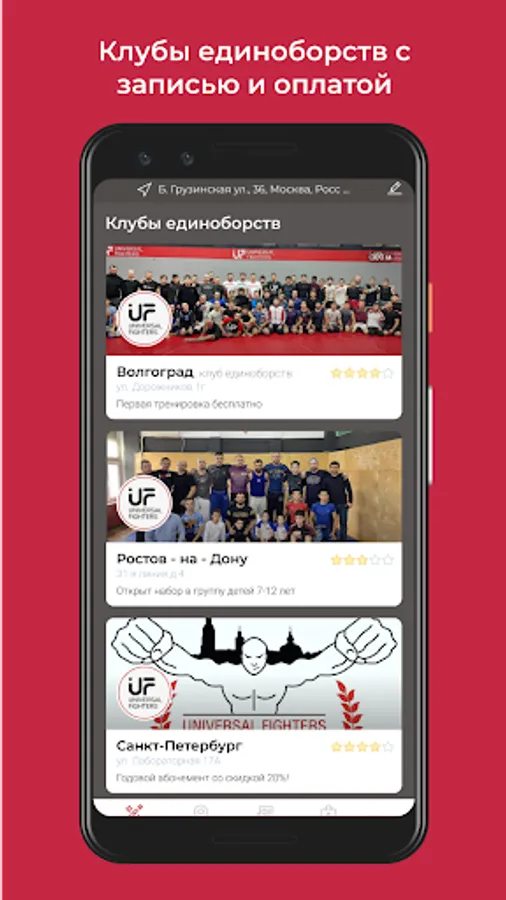 In our feed you will find news, schedules and video broadcasts of league tournaments, special offers from league partners. In the Clubs section, each club is individual and offers many options for both beginners and experienced fighters - built-in chats, registration for training, a built-in online store, the ability to pay for training and subscriptions, club promotions, profile content for visitors, and much more!