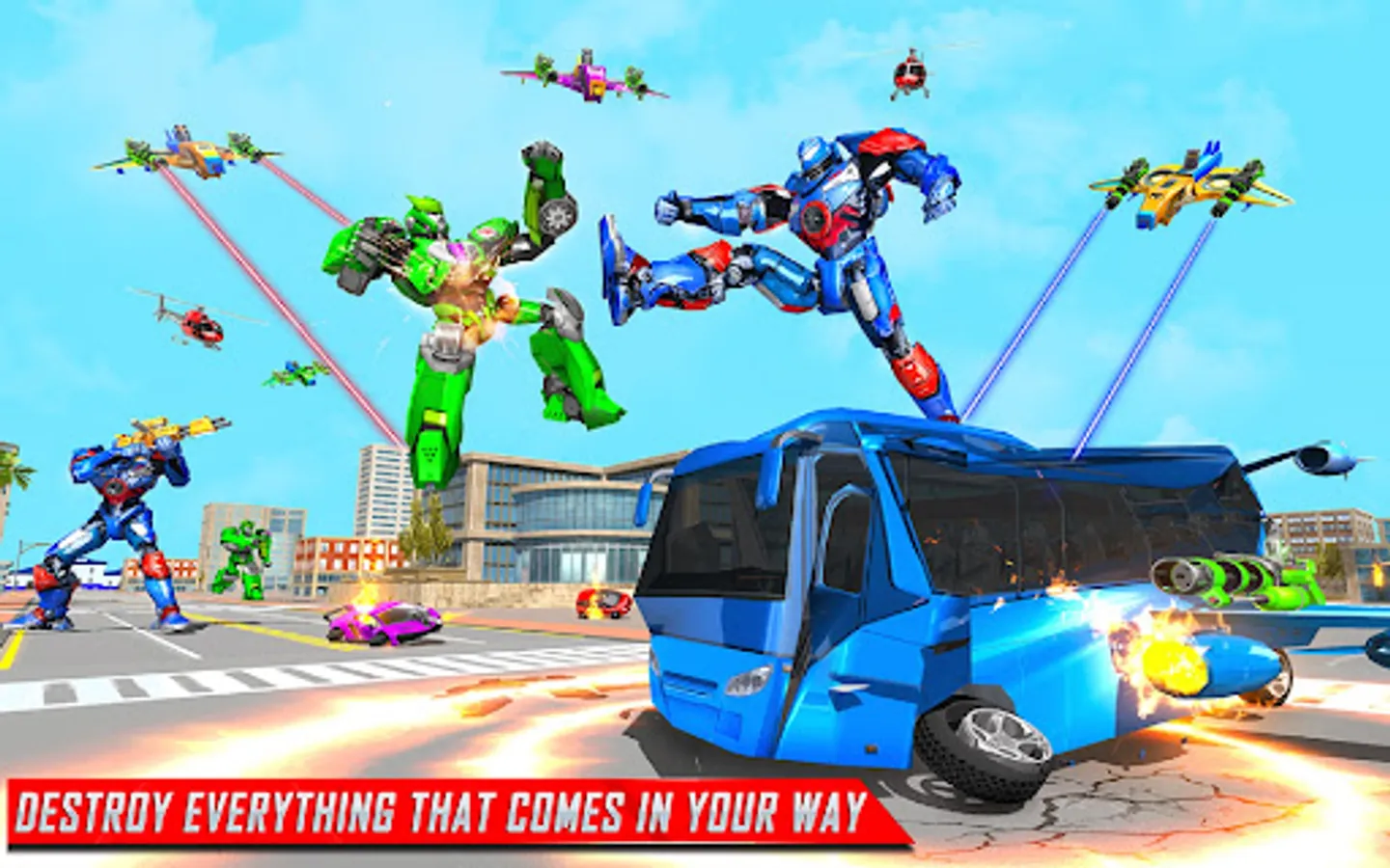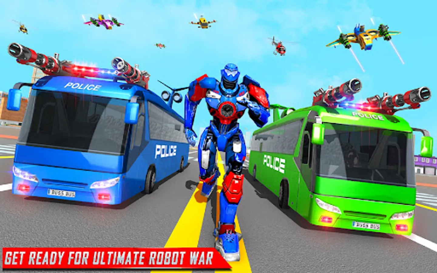 Welcome to this new edition of flying bus robot game that has extensive gameplay of countless robot transformation with multi robot game in flying bus robot car game. This war robots game has a huge variety of indian bus robot games fighting modes including dino robot boss fights and multiplayer battles, all combined in indian robot transformation game with missions of police robot car game. Your transforming bot hero will multiple superpowers which you can use in mech robot wars to kill your opponents of car robot game like gorilla robot, mech robots, dinosaur robot, tank robot, zombies and other war robots in this police bus robot game or robot wala game. Even the collection of transformations in indian robot car game is huge where you can transform into helicopter robot, indian bus robot, mega truck robot, female bot and jet robot, all in this new robot game, making it qualify for the category of best robot game in robot wala game. Survival mode of this robot transform game is also interesting where you fight mech robot war with large number of evil transforming robots unseen in other flying car robot games or mech robot transforming game. All this takes this flying bus police robot game to an all new level of offline robot game and multi robot game.