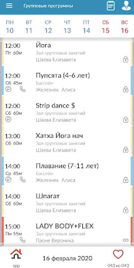 - output of the current, current schedule with the possibility of horizontal scrolling for changing the week and vertical scrolling in the format: the name of the program, the venue, the name and surname of the instructor, the day of the week, the start time of the lesson, the duration of the lesson;