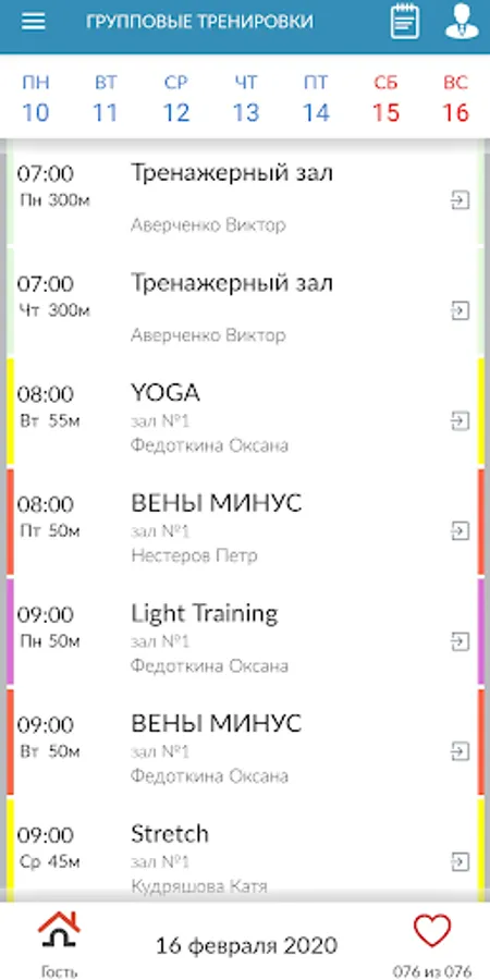 - view the schedule for any day of the week (by clicking on any date of horizontal scrolling of weeks at the top of the screen)