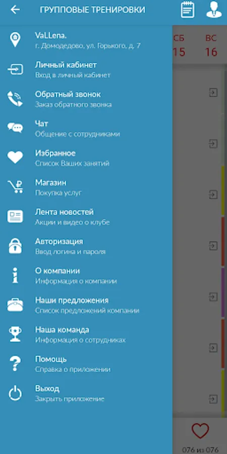 The application shows the class schedules in the club Vallena with the possibility of registering and recording for a specific lesson.
