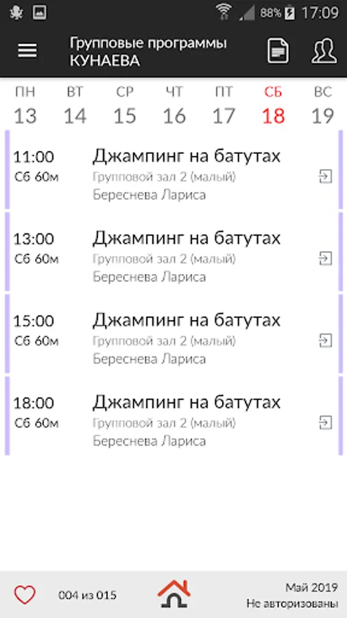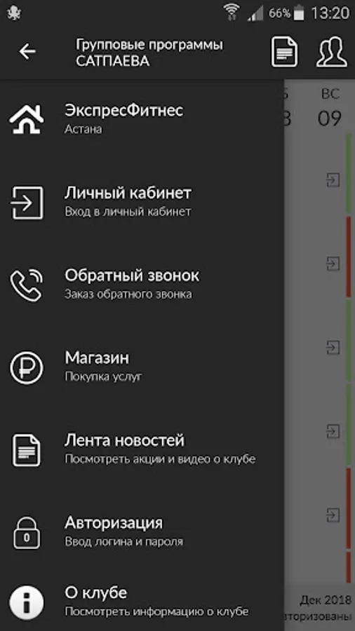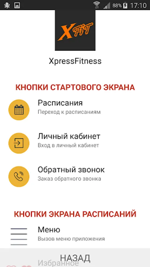 The application shows the schedules of clubs in the XpressFitness system with the possibility of registering and recording for a specific occupation.