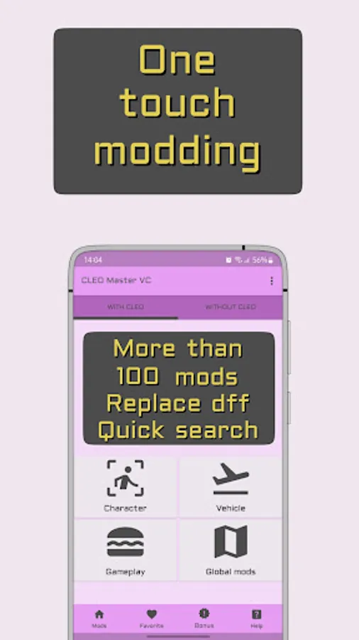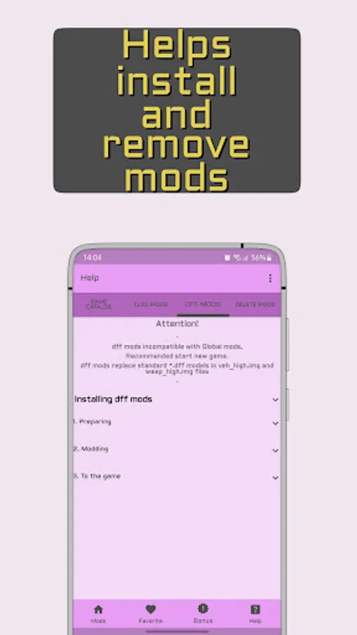Detailed instructions for installing mods and dff models help you get started quickly. You can remove installed mods with a single tap.