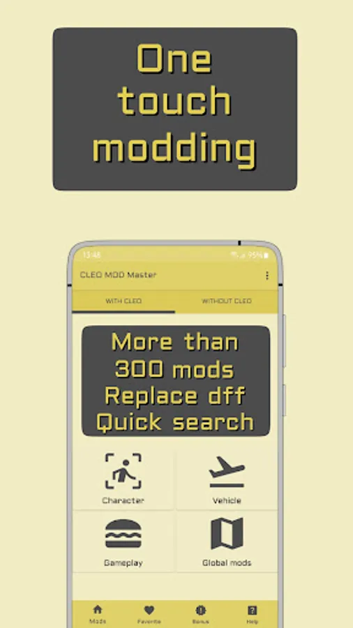 The convenient search function allows you to quickly find the desired mod by name. All mods and scripts cleo and non cleo are sorted by category, making navigation easier. In addition, you can add mods to your favorites for quick access