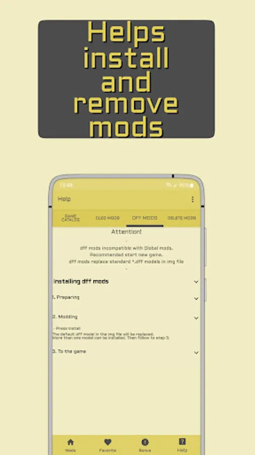 Replacing dff models is fast and easy, enabling you to change default cars, planes, boats, motorcycles, trains, helicopters, and weapons with just a double tap. Detailed instructions for installing mods and dff models help you get started quickly. Remove installed mods with a single tap.