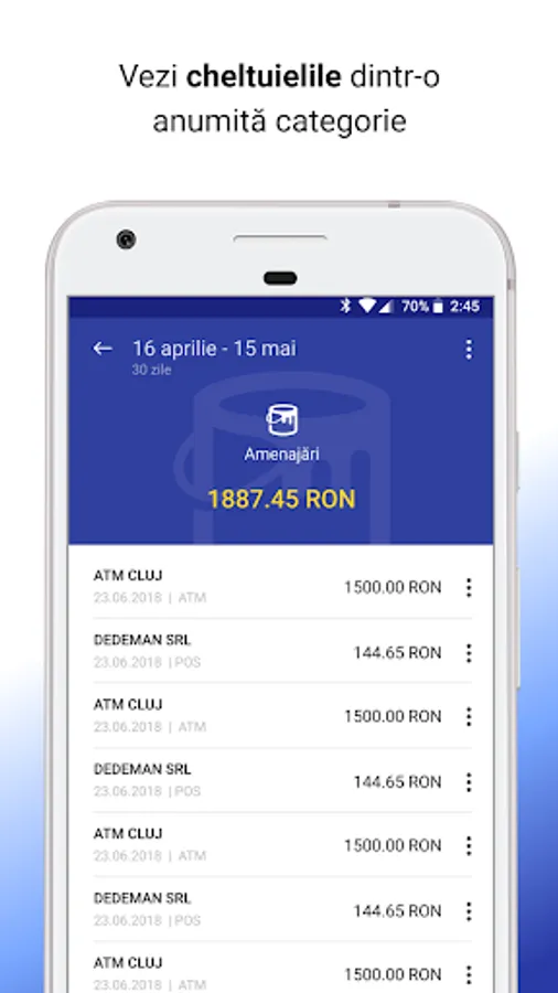 Mony relies on text messages you receive from Banca Transilvania, ING, BCR, CEC and Banca Romaneasca each time you use your credit or debit card. This saves you from manually typing the amounts. Most of your transactions are automatically categorised based on merchant information.