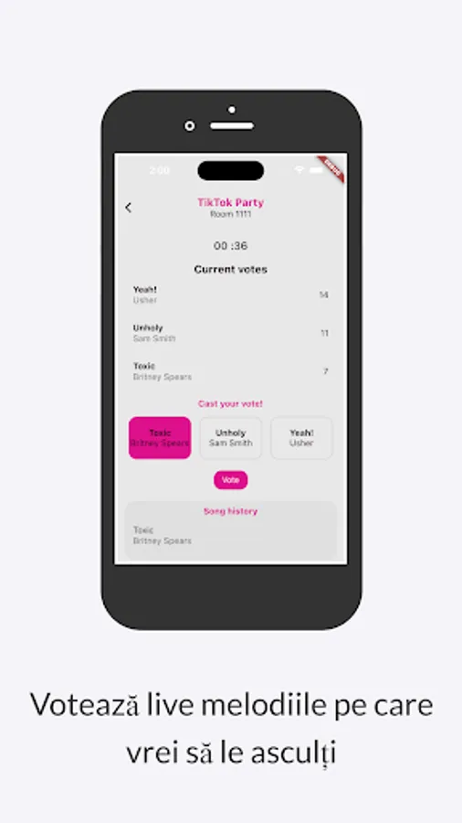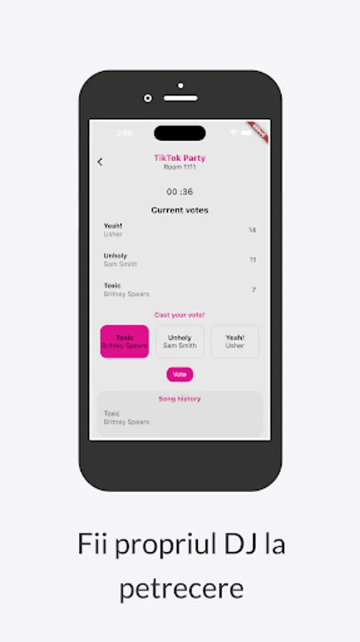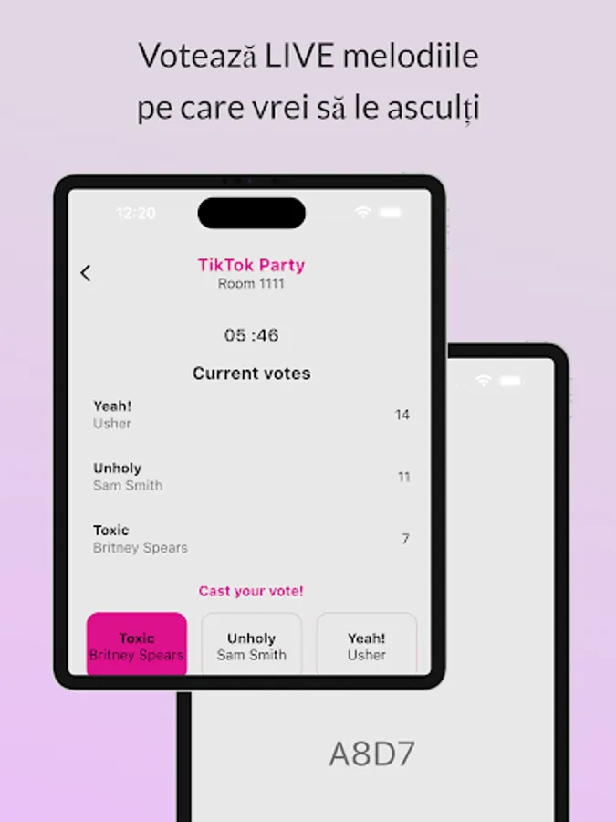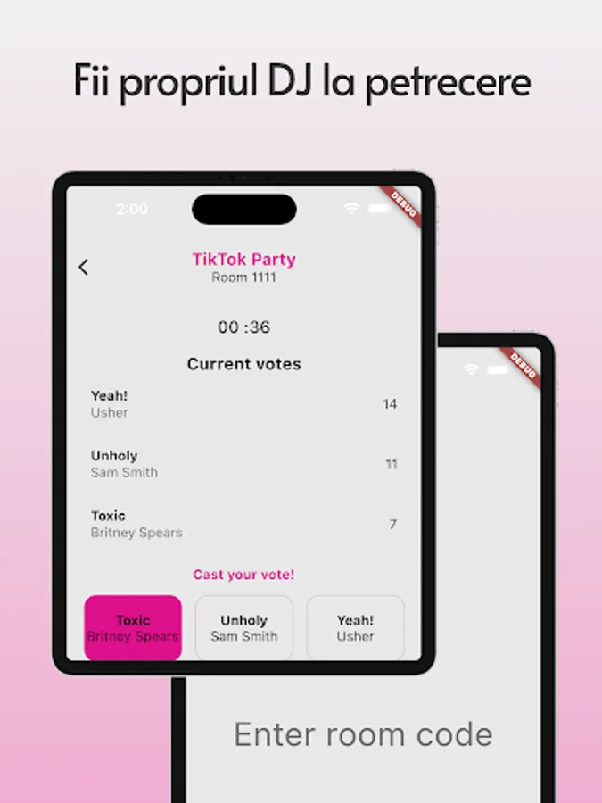 Users enter the code to the room correspondent to their party and than vote which song they want to play.
