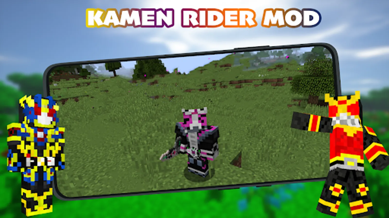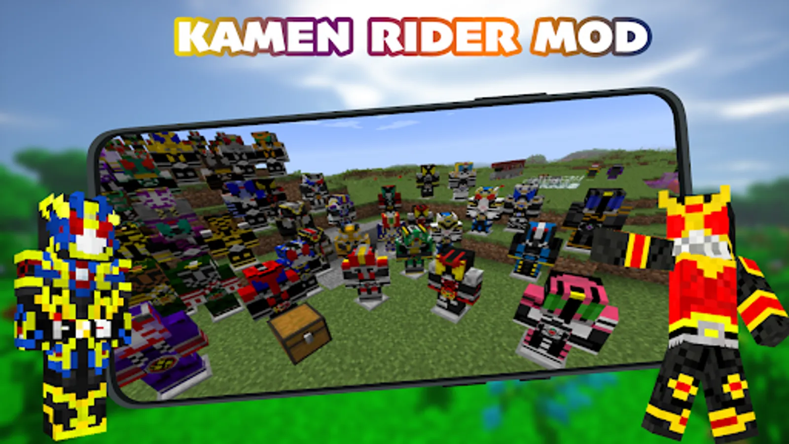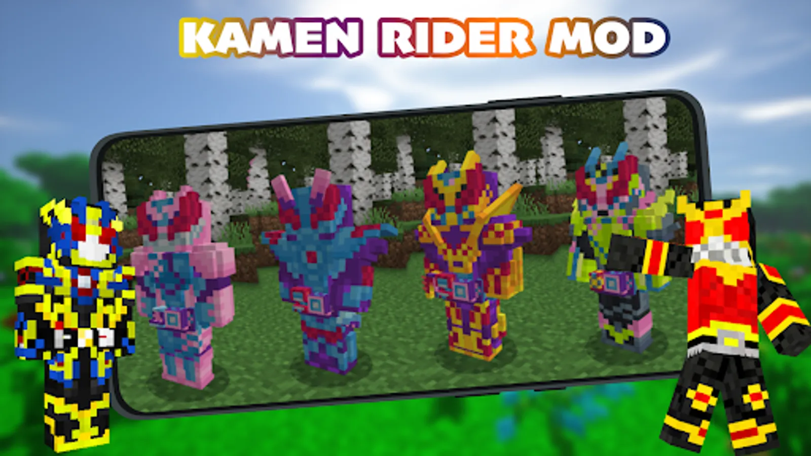 There are more than 100 interesting and high-quality rider skins in Kamen Rider Mod for Minecraft PE. This addon for MCPE will allow you to get these skins easily and absolutely free. Nowadays it’s one of the most interesting addons about Kamen Rider, so this Mod for Minecraft PE is a must have on your phone.