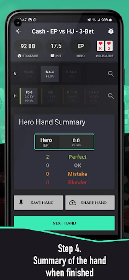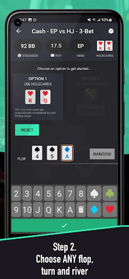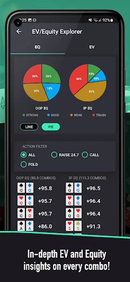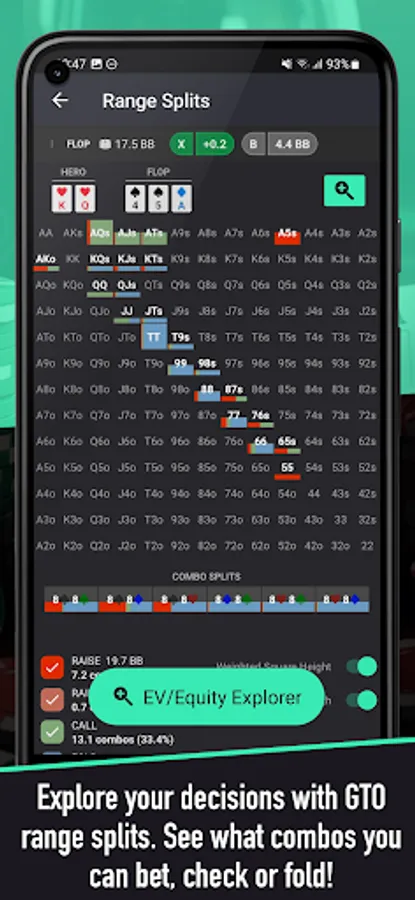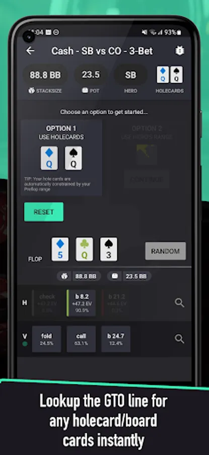 Your personal GTO postflop lookup assistant and poker engine AI solver in your pocket. No need for complex tree building and then buying grunty super computers to run postflop solves. We did all the hardwork and making it accessible to you via a few clicks on your mobile phone. Just pick a spot, enter your hole cards, the board and voila! You can see the GTO line for all possible turn and river with the exact frequencies and EVs.
