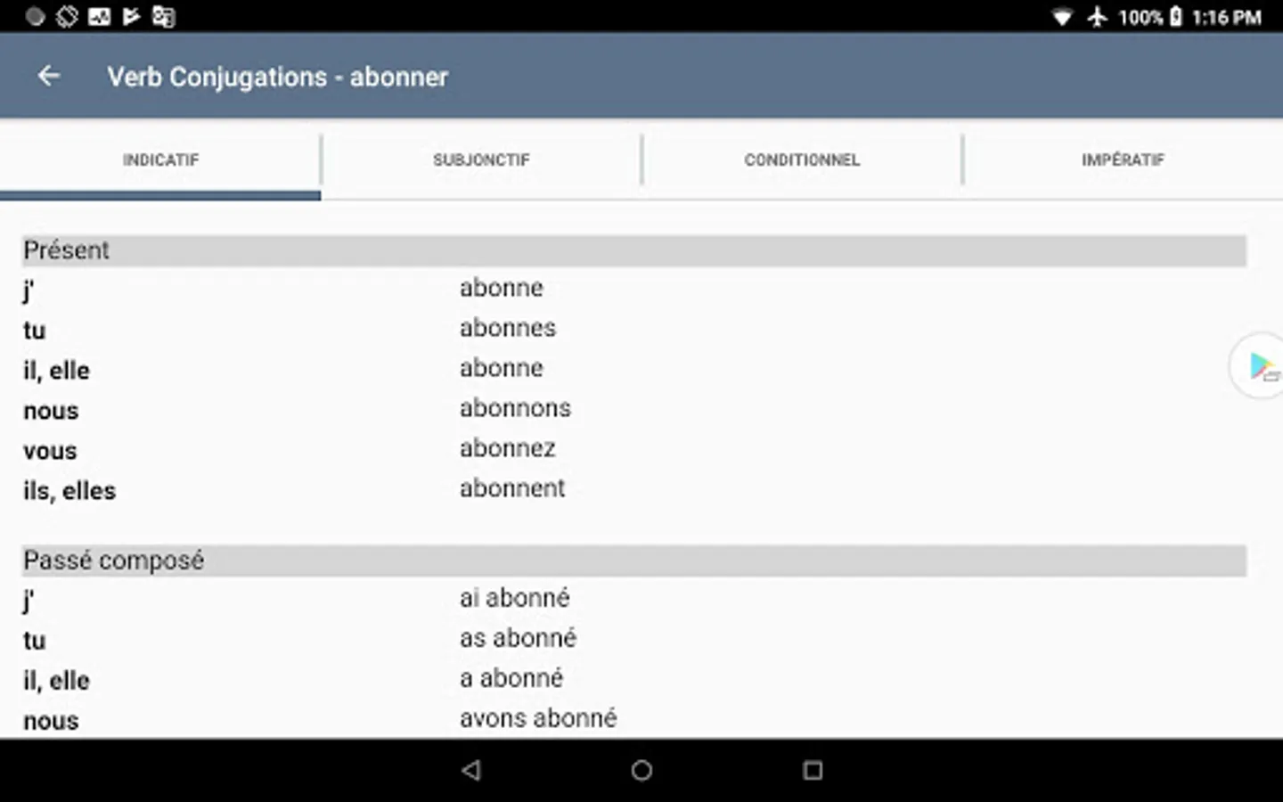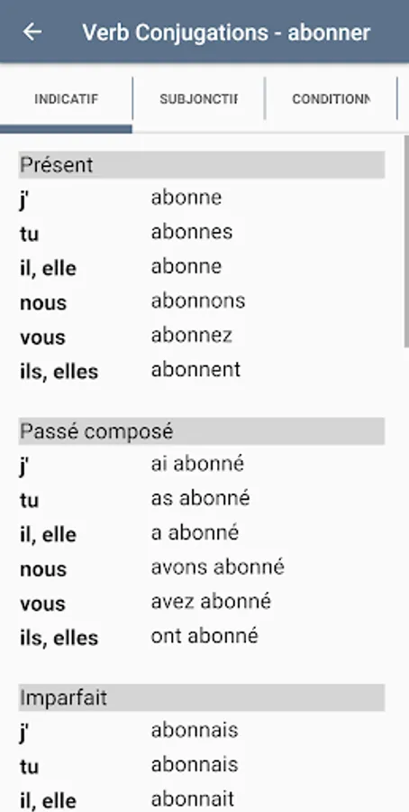 + Integrated verb conjugator: see conjugations of more than 9000 french verbs!