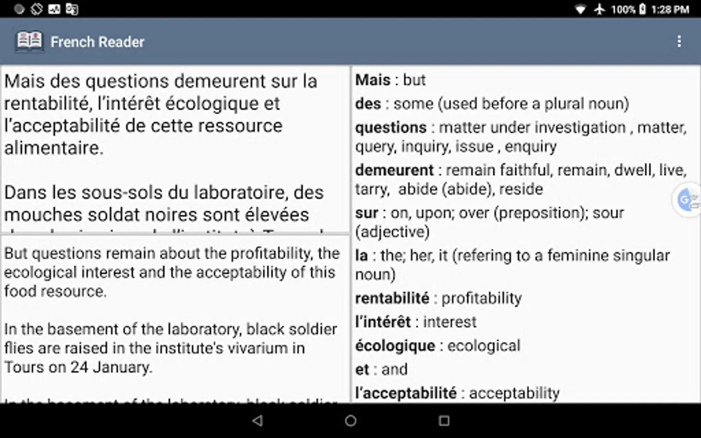 + Integrated offline French - English dictionary with an instant tap-to-translate support.