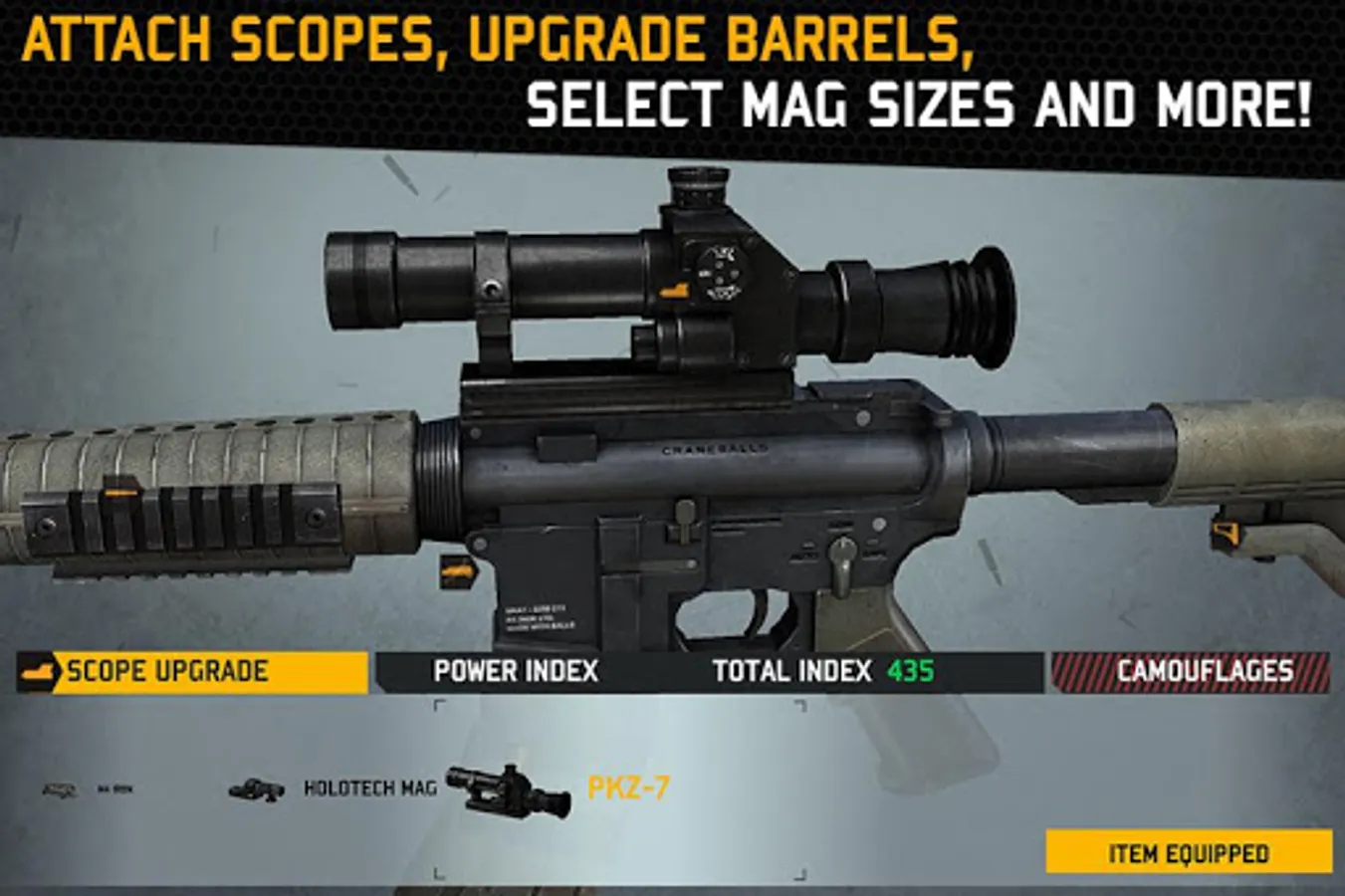 The good news doesn't end here. There's more! Every gun comes with extensive choice of upgrades. All guns are completely customizable! Add muzzle and barrel upgrades, mount optical red-dot scopes, extend your magazine clips and attach aftermarket stocks to fight recoil. These will greatly improve the performance of your gun and make it the ultimate tool for bringing down the hammer.