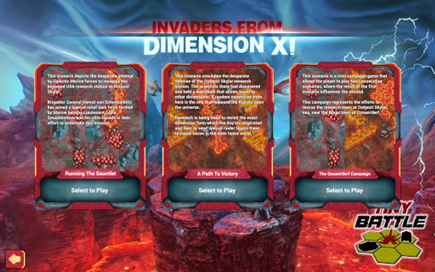Invaders from Dimension X! is a solitaire game that begins the story of the brutal war between the invading alien Kay’otz race and the only human force capable of defeating them – the “Old Reprobates” of the 124th Galactic Marine Raider Battalion. You control the various Marine squads, each with a specialized skill, as they fight their way through an alien enemy that is totally unpredictable. The Kay’otz come from another dimension of space and do not behave in a way humans can comprehend. Only with perseverance and skillful strategy – and yes, some good fortune – will you be able to eventually discover the plans and tactics of these mysterious beings.
