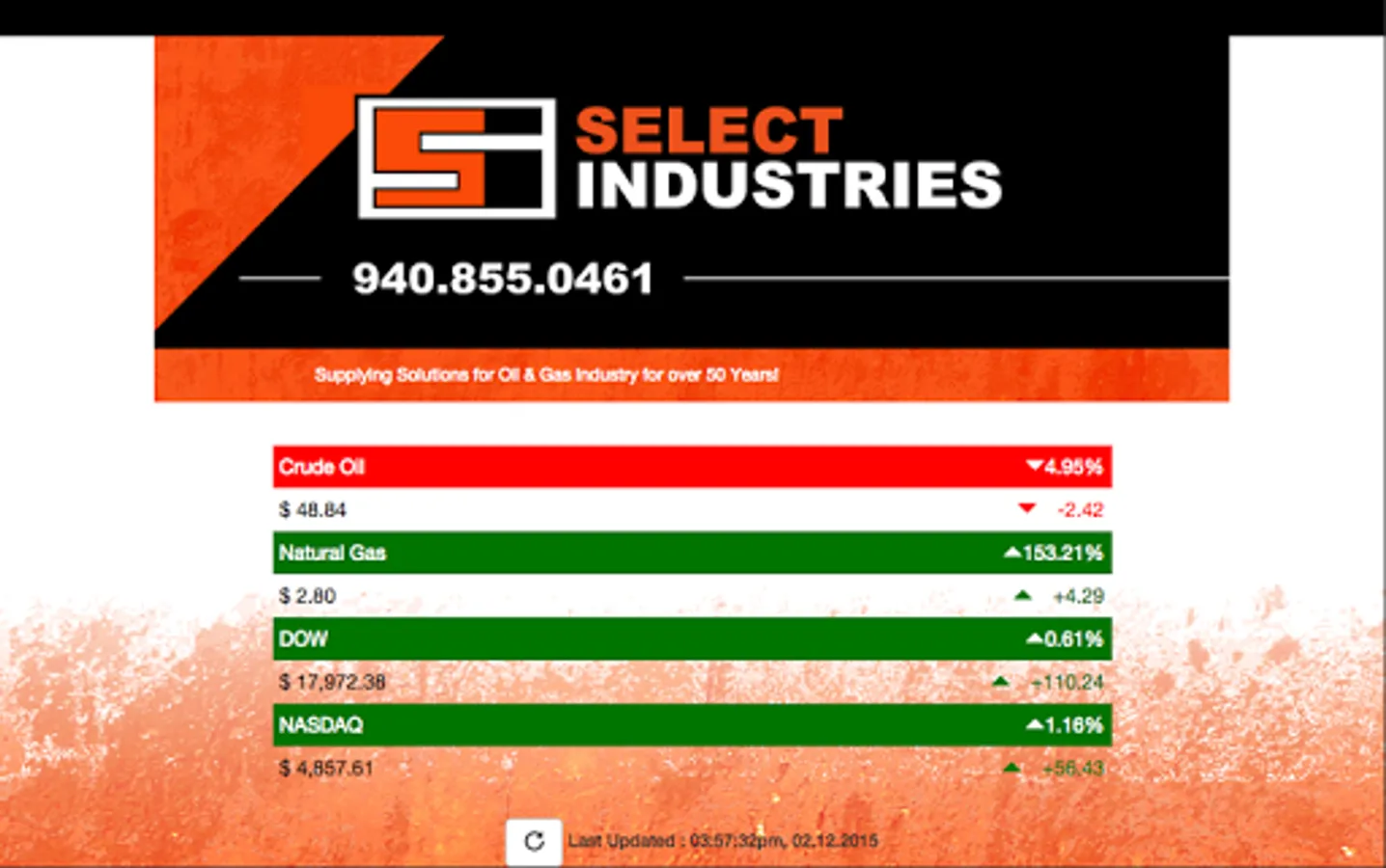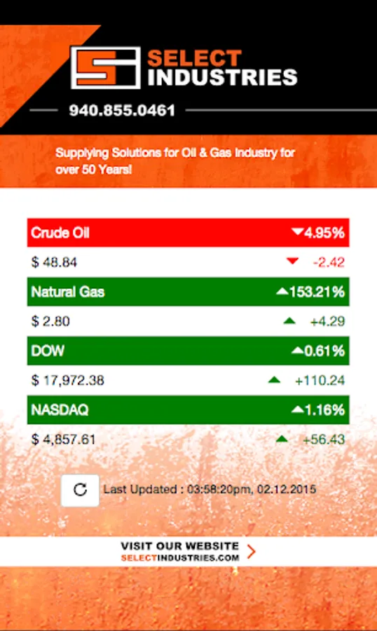 Get the latest Crude Oil, Natural Gas, DOW, and NASDAQ prices and averages. This ticker powered by Select Industries will keep you up to date!