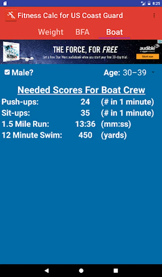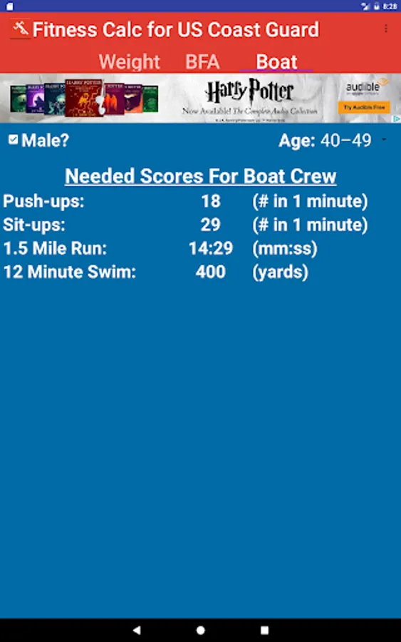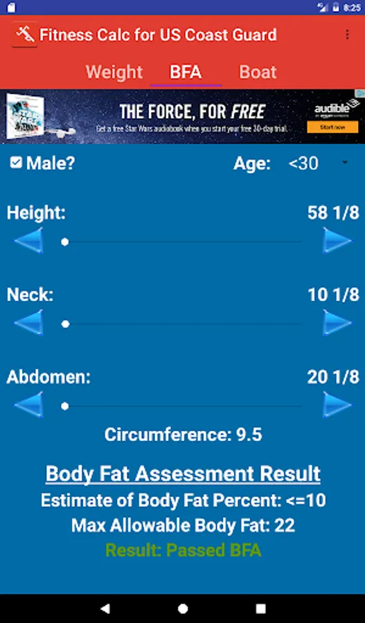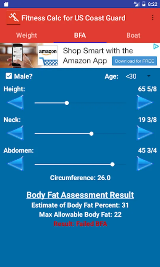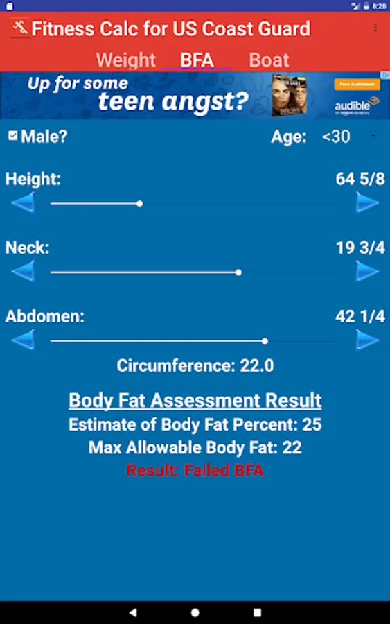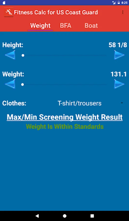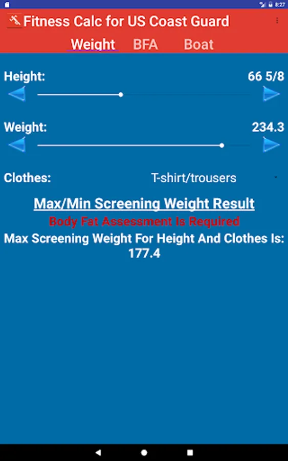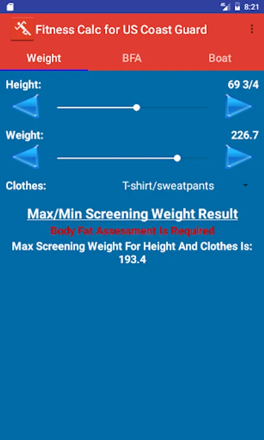 Application to determine compliance with US Coast Guard Body Fat and Fitness Standards.