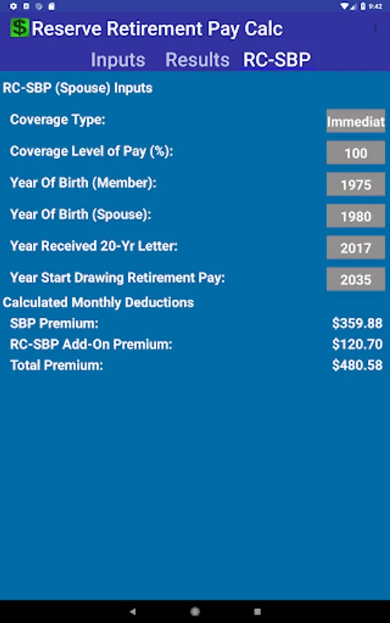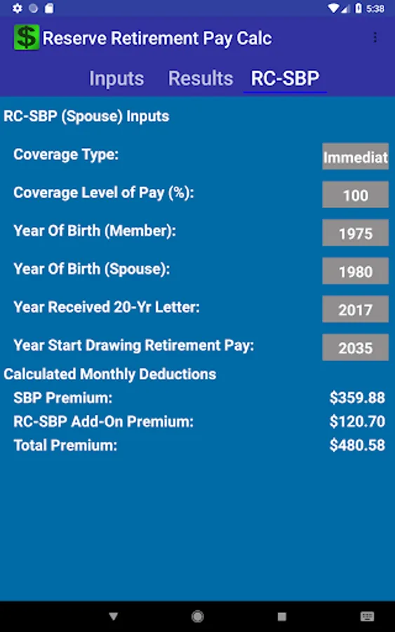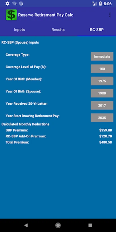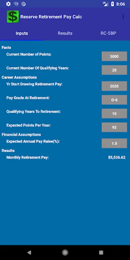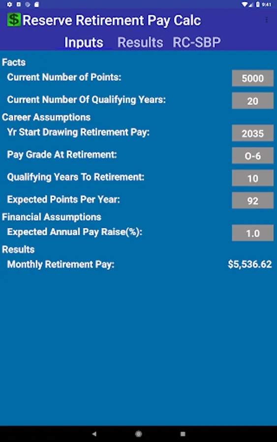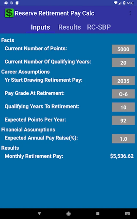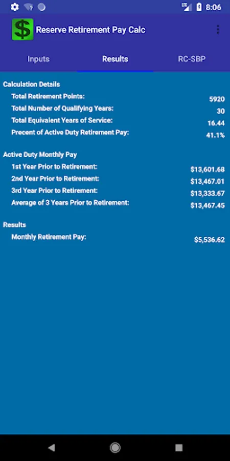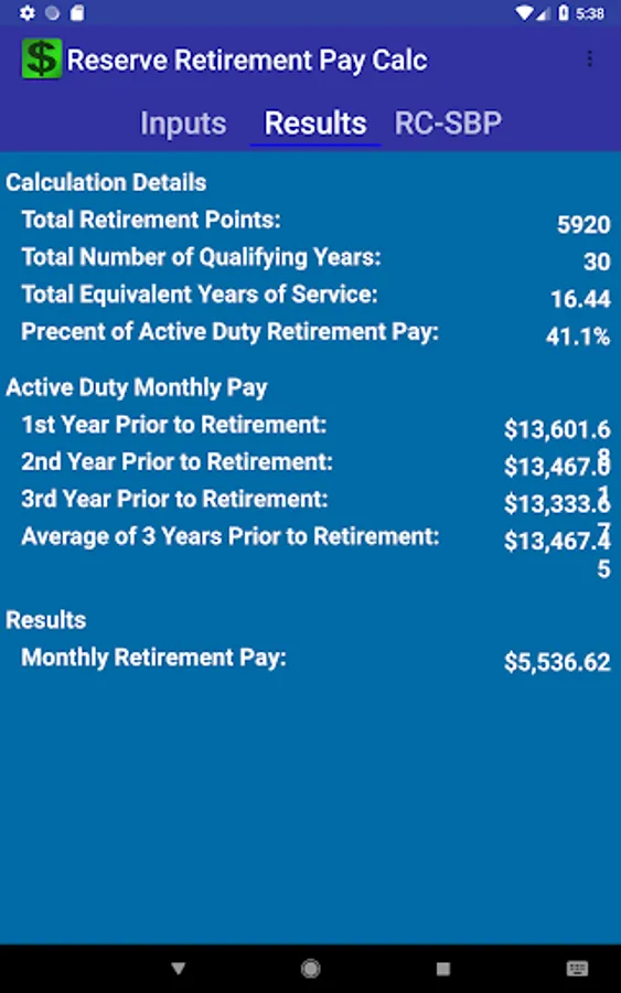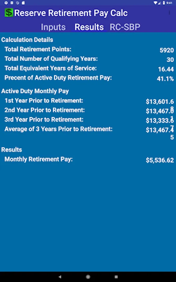 This app will calculate the expected retirement pay for US military reserve/guard service members. It also calculates expected RC-SBP (Survivor Benefits Program) premiums.