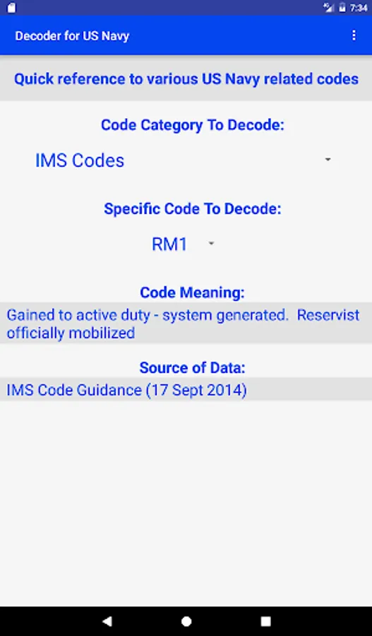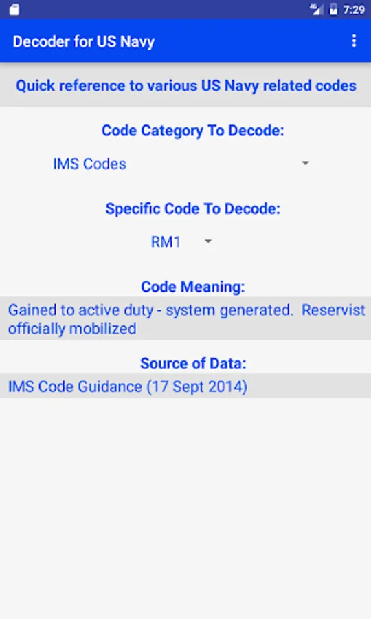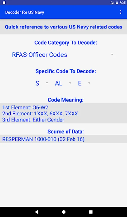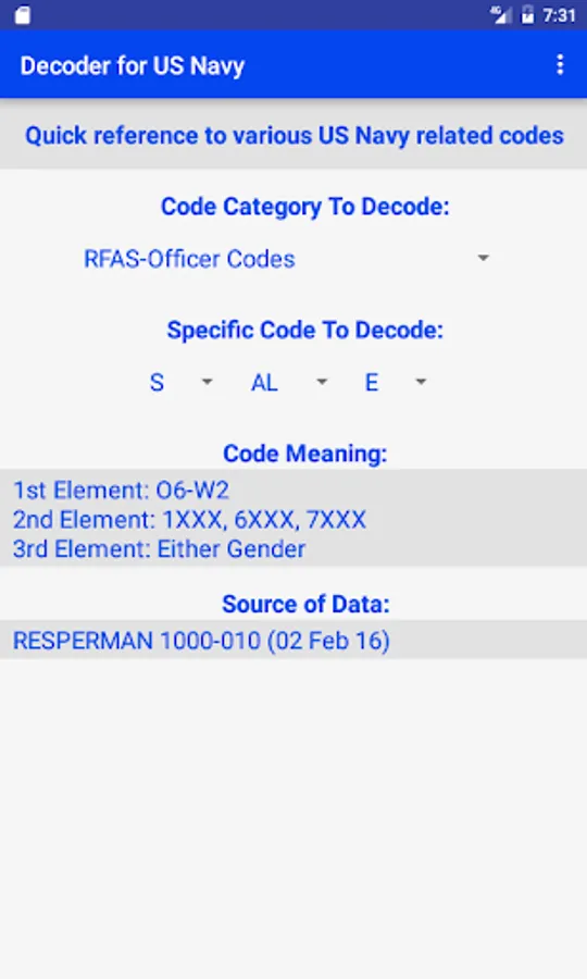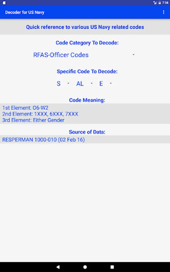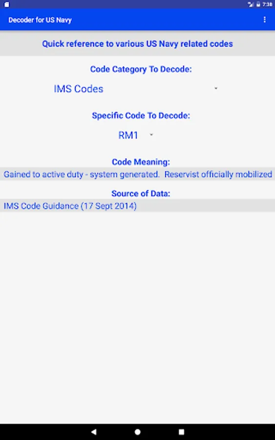 This app is a quick reference guide to many US Navy personnel and other codes. Instead of spending the time to find the correct reference and look up the information, this app will allow one to quickly get to the answer.