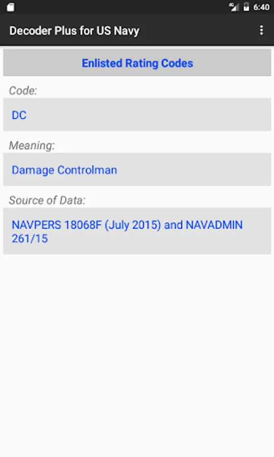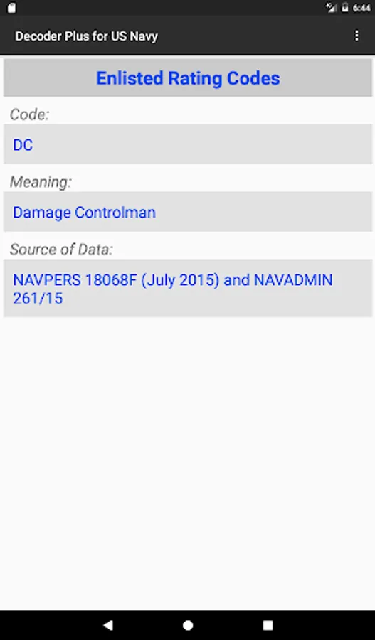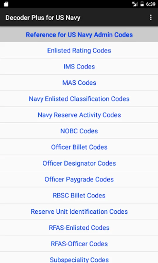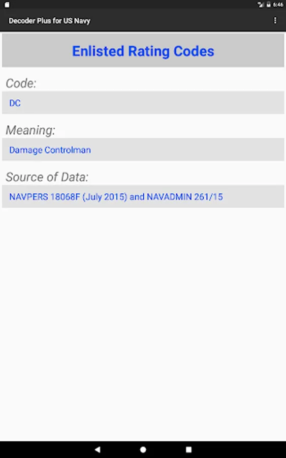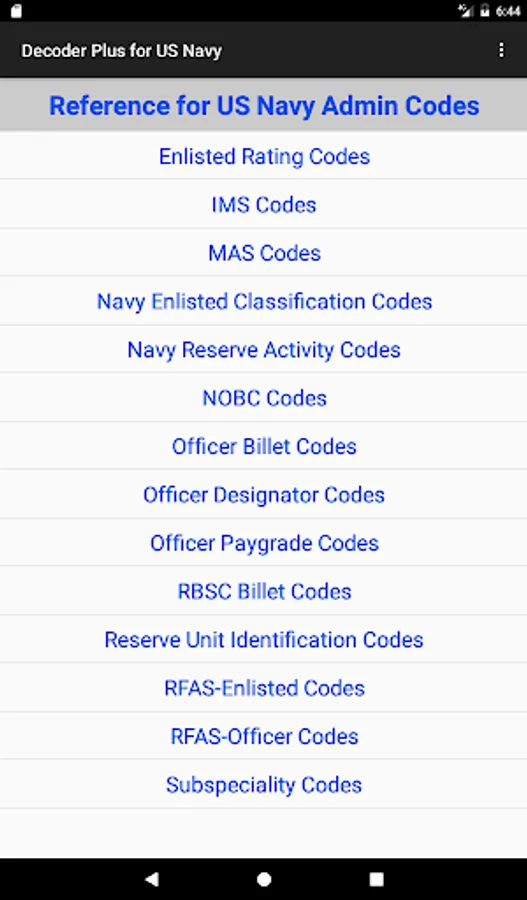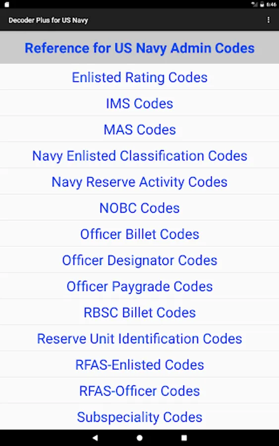 This app is a quick reference guide to many US Navy personnel and other codes. Instead of spending the time to find the correct reference and look up the information, this app will allow one to quickly get to the answer.
