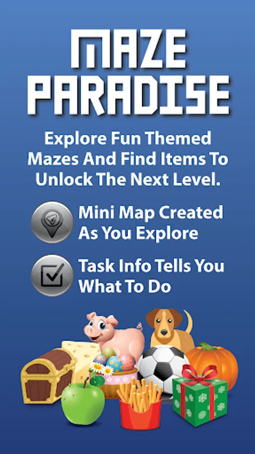 Maze Paradise has fun and addicting 3D style virtual mazes for you to explore and find items. The goal of some mazes is to find the items to unlock the next maze while other mazes you need to find the items and then go through the exit to unlock the next maze. There are 10 fun themes and 400 mazes to get lost in and explore. A mini map is created as you explore each maze which you can refer to for help navigating the maze. Mazes get harder and bigger as you progress. The maze themes are: Corn, Cheese, Santa, Farm, Sports, Food, Fruit, Pirate, Easter and Pets.