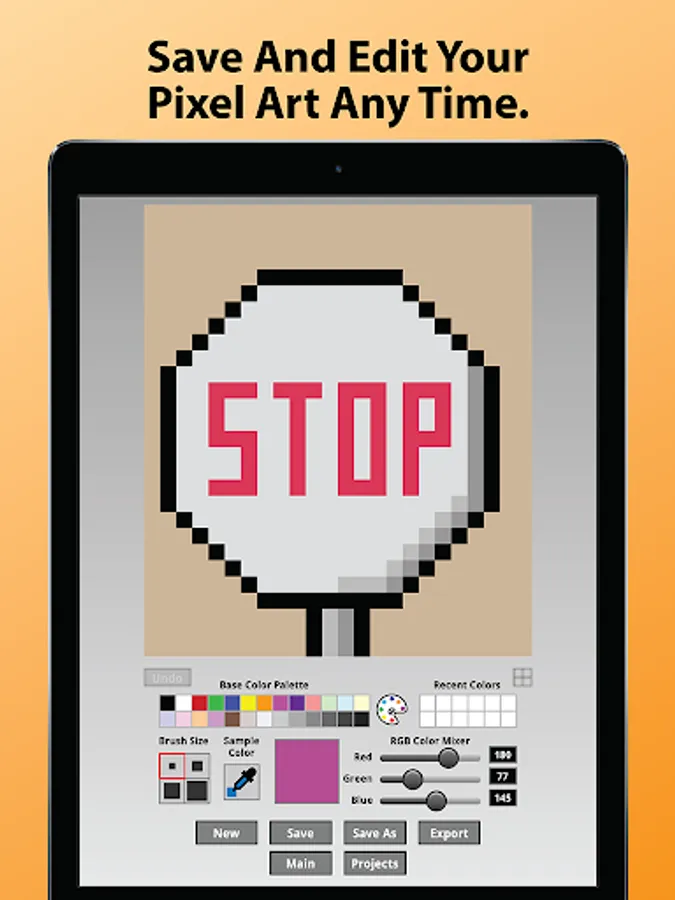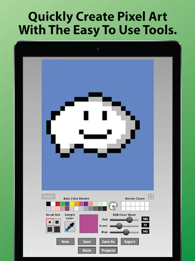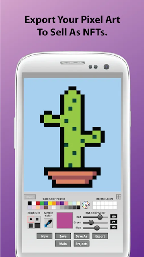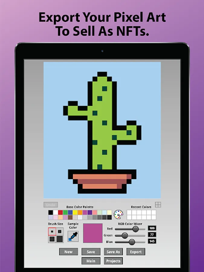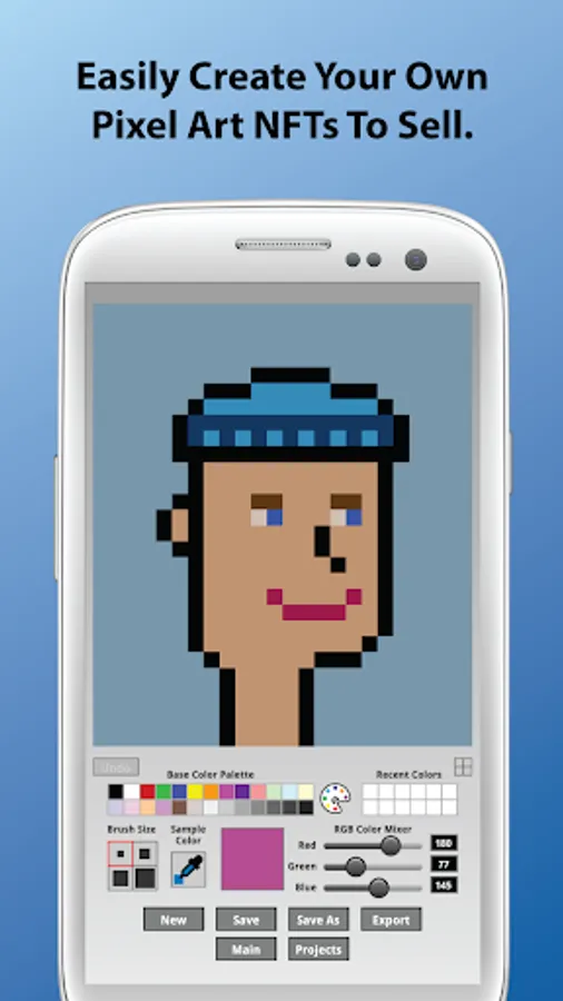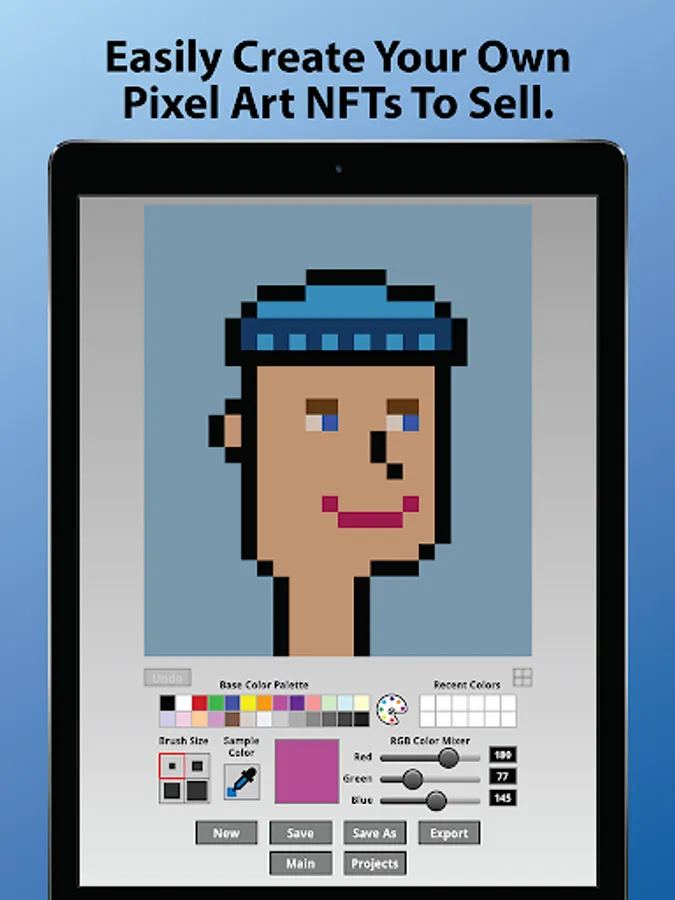 Create amazing NFT art with this easy to use pixel art creator! Quickly design and save your own NFTs. Export to your photo library when you are ready to upload to a NFT marketplace blockchain like Opensea, Axie Infinity, Rarible, Nifty Gateway, and SuperRare where you can sell your art.