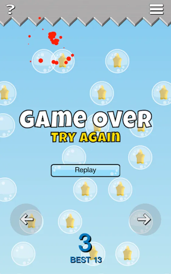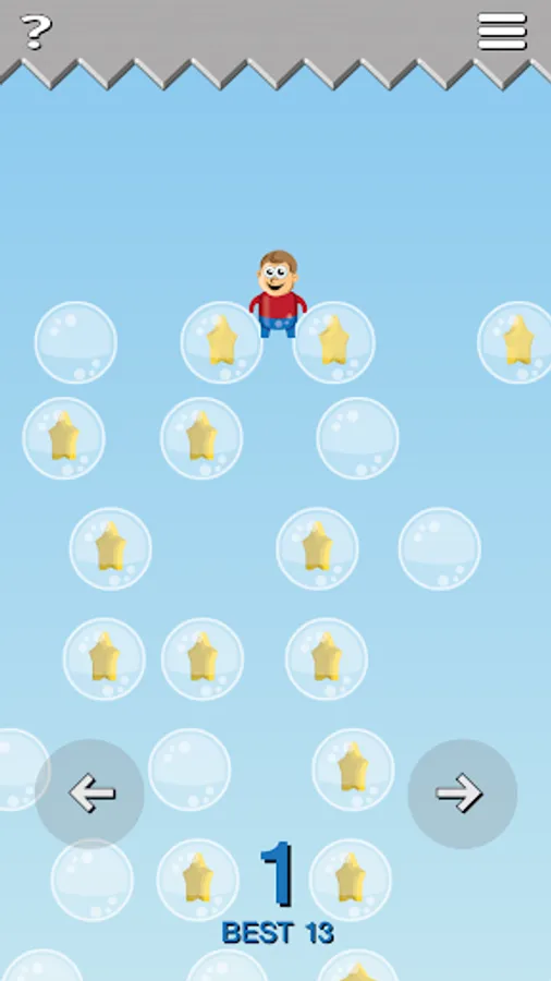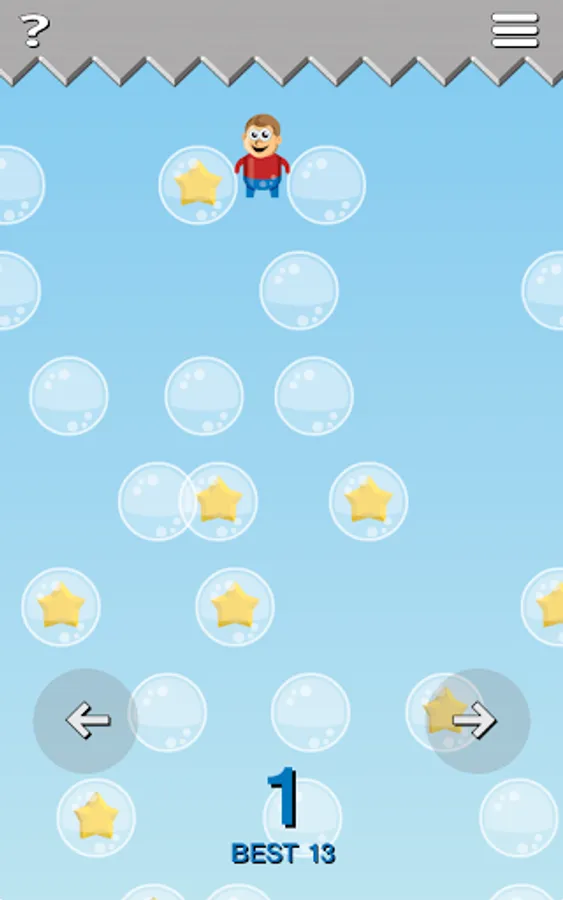 This a fun addictive endless play game where you need to maneuver your player to collect as many stars as possible. Use the arrow buttons to jump right and left. Touch bubbles to pop them and release the stars. You may also want to pop bubbles to help fall into a better position. The game will end if you die from the spikes or fall off the screen.