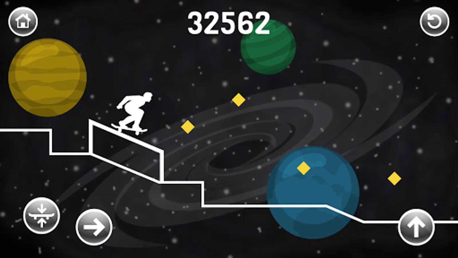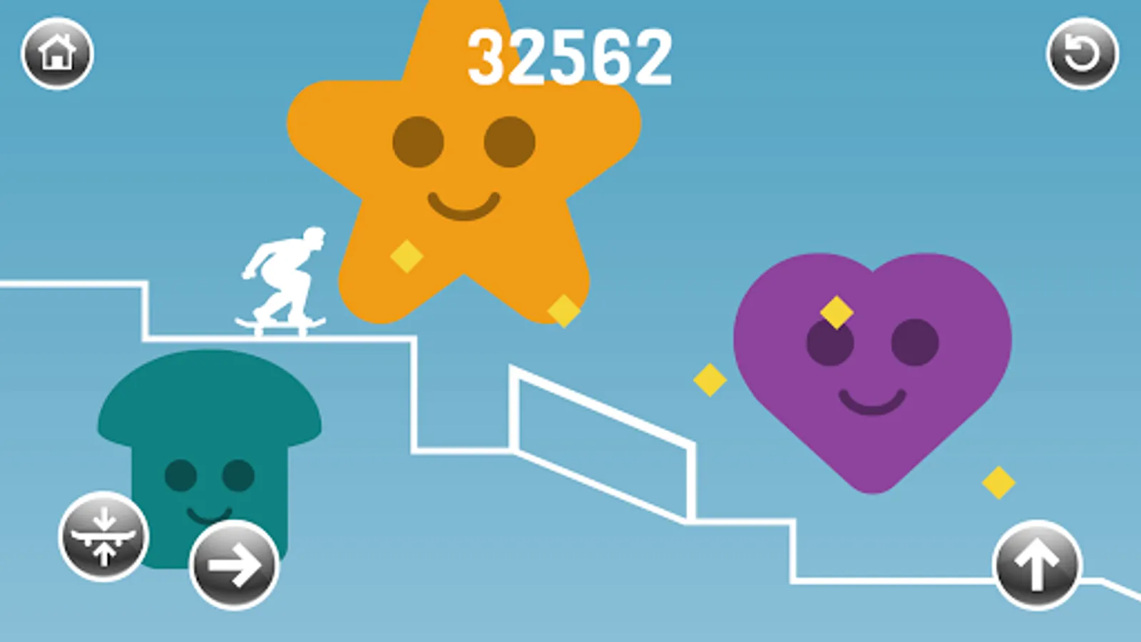 Skate the line while getting points from picking up diamonds and grinding on the rails but avoid the spikes. Use the diamonds you collect to buy other skate characters and themes. Use the right arrow button to move forward, the up arrow button to jump and the skateboard icon button to level out the skateboard.