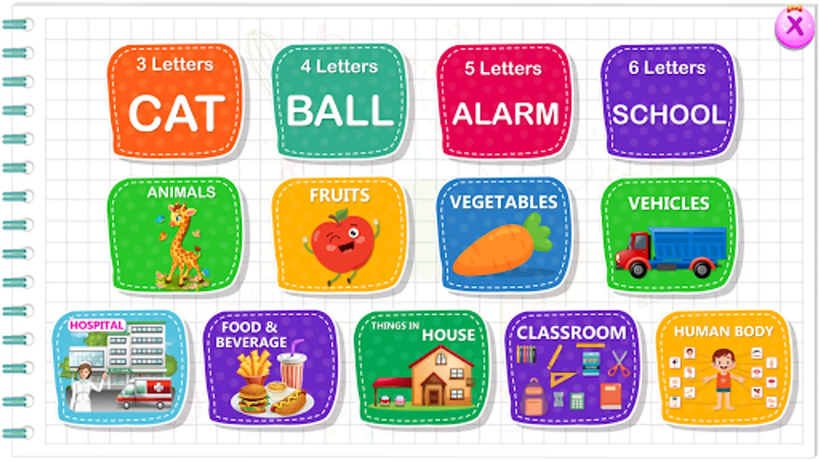 By seeing the pictures Kids can guess spelling this is the best feature for to improve good learning skills for kids. In each section included 300+ spelling.