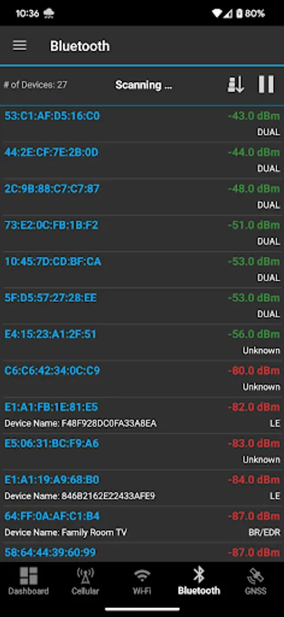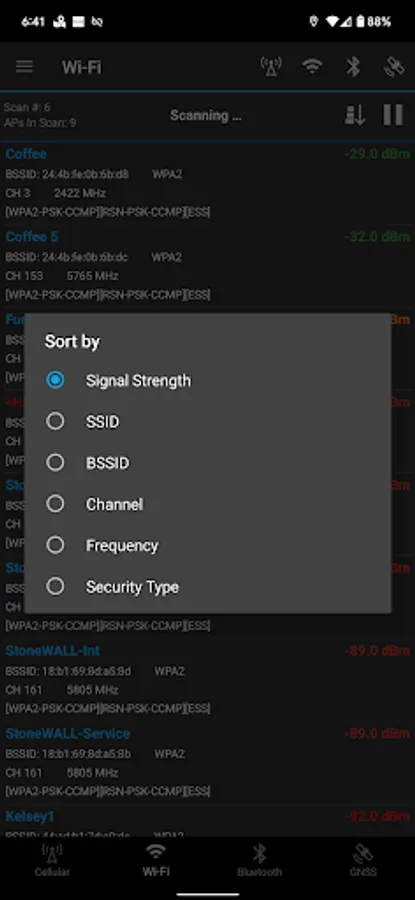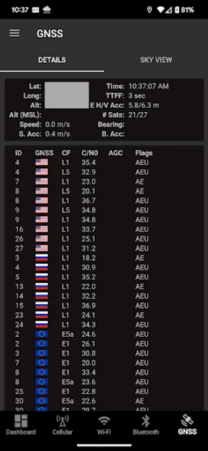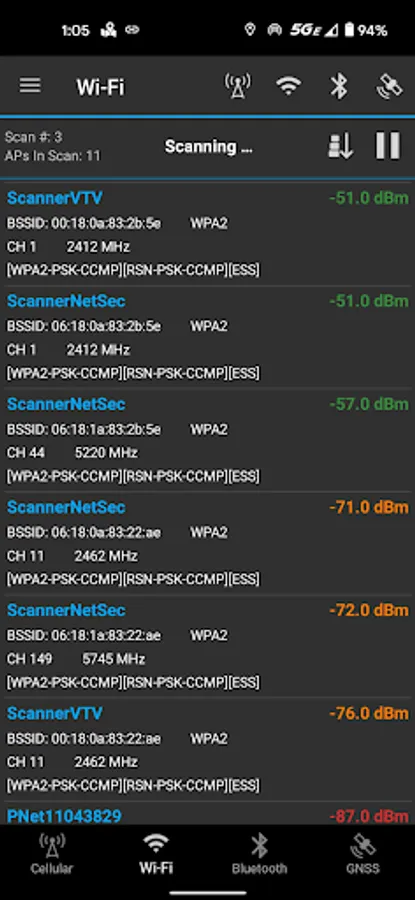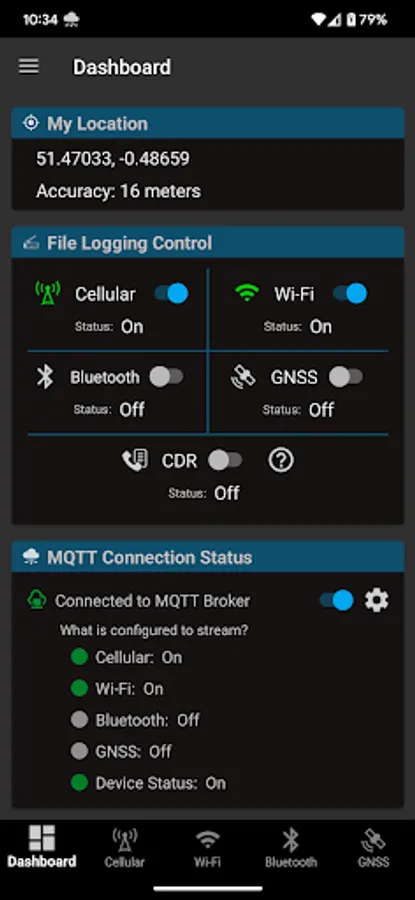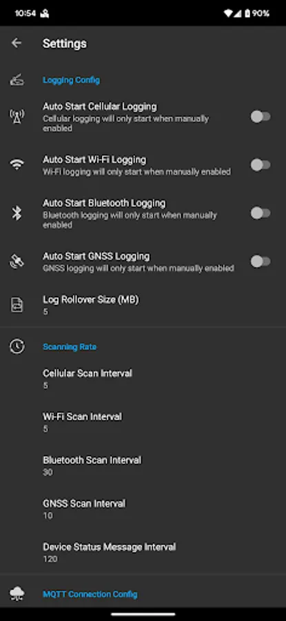 The Network Survey app enables logging cellular, Wi-Fi, Bluetooth, and/or GNSS information to a log file (GeoPackage format). For cellular records it supports logging GSM, CDMA, UMTS, LTE, and NR records.