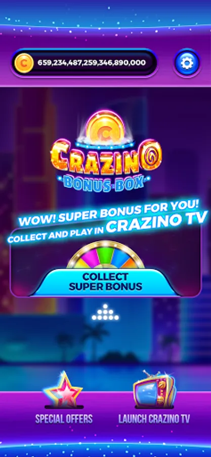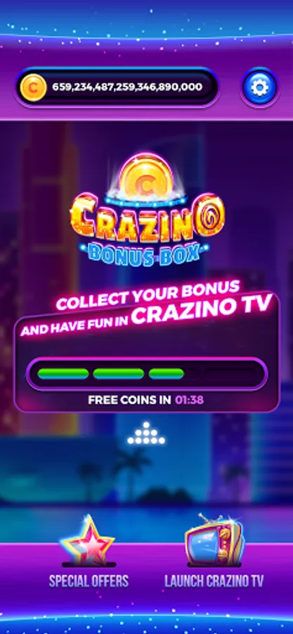 Could you ever dream of earning bonuses on the go? We’ve made your dream come true! Welcome the brand new Crazino Bonus Box app. Now collecting bonuses is as easy as ABC. All you need to do is to tap the “Collect Bonus'' button every once in a while. All of the bonuses collected in Crazino Bonus Box will be added to your Crazino Slots balance. You can spend them anytime you want playing your favorite slots on TV. Not only will you not lose a single bonus, but you will also get much more benefits than ever before!