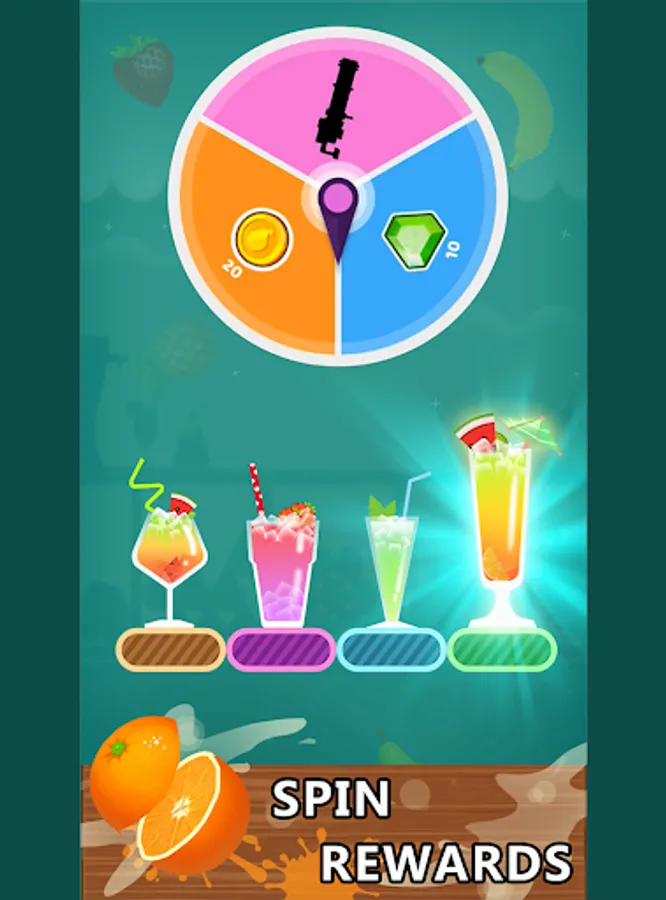 A glass of juice is made each time you finish a level. After 4 glasses are done, you get a chance to spin a lucky wheel and collect rare rewards!