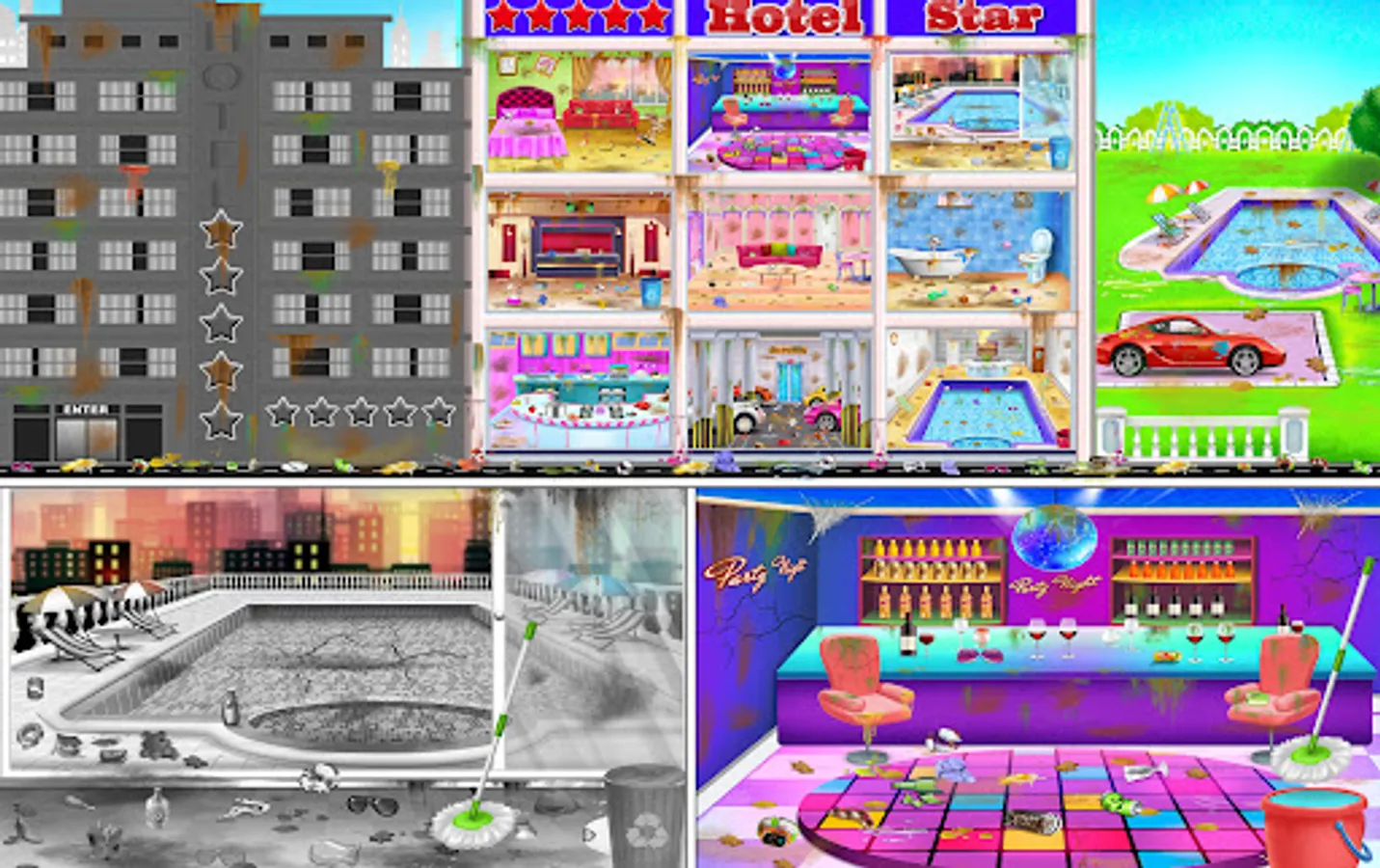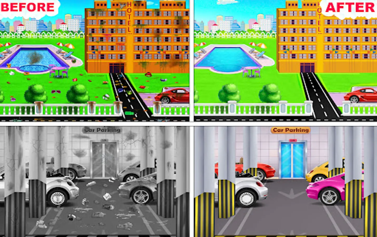 This is a excellent collection of cleanup games with plenty of public places levels like Reception, Guests room, Swimming pool, Bathroom, Bedroom , hotel, Hall room, Kitchen which include many principal things to teach girls how to make their home and city neat & clean. Let's play the most impressive educational cleaning game where all age people can learn something new every time about housekeeping skills. This Game Include Many public places of your city as described below.