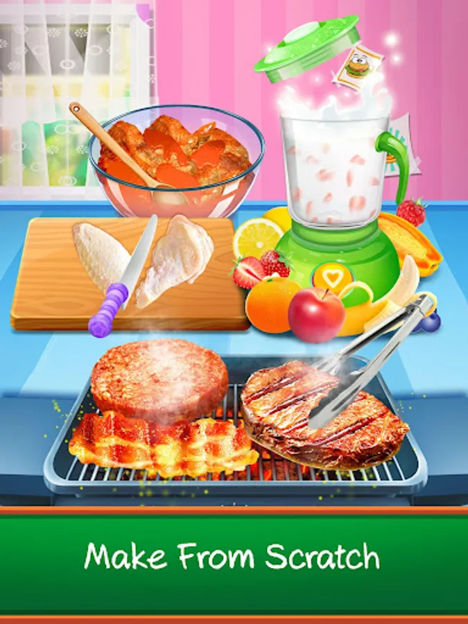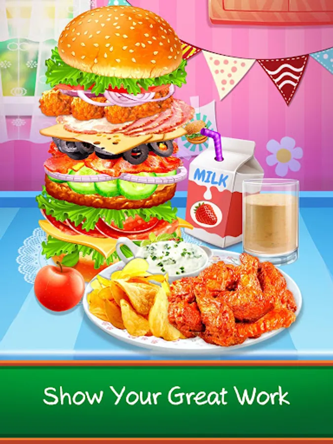 Hmm~ The school cafeteria food? GROSS! It's time to take matters into your own hands. Put on your chef hat and head to the kitchen! We're going to make the ultimate lunch food: hamburger, buffalo wings, juice & milk. Great, Let's play.