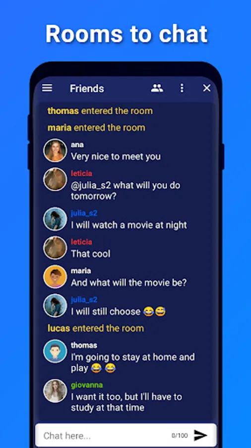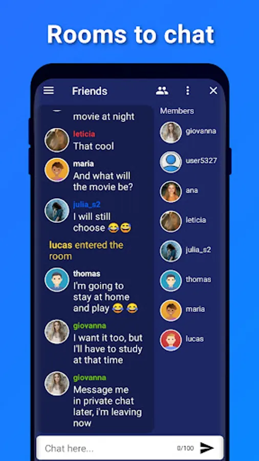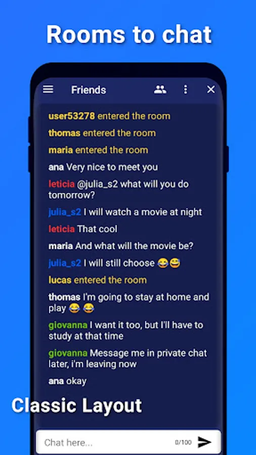 Chat only with your friends? No problem! You can create a room with a password and call your friends, so only those who have the password can enter and, when everyone leaves the room, it will be automatically deleted!