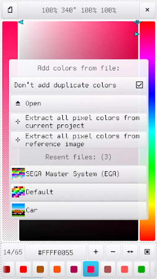 - Quick access up to 20 recent image files and palettes