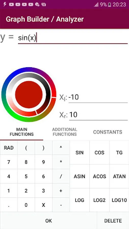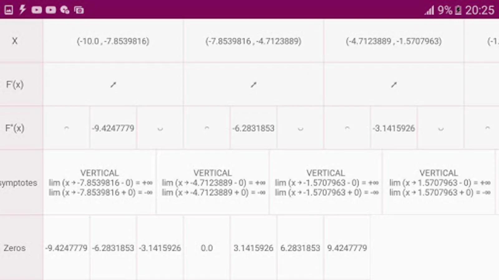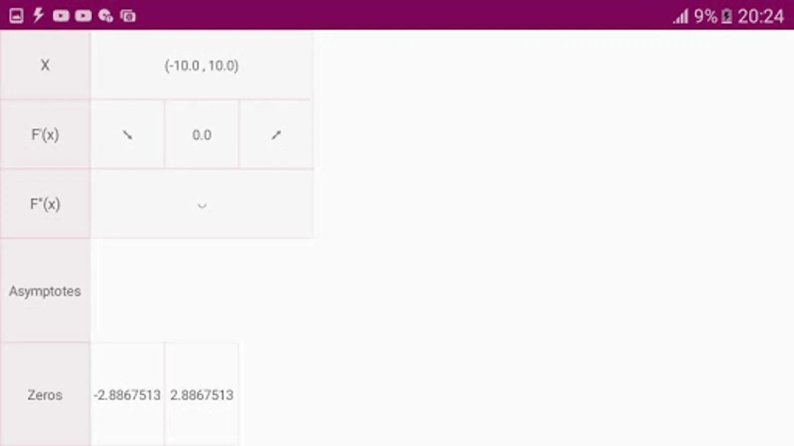 This app is created to depict graphs and to analyze them. You can get information about derivatives', asymptotes (horizontal, vertical and tangential), intersection points of graph and X axis and range of function. App uses numerical methods, so complex formula calculating takes some time (usually several seconds).
