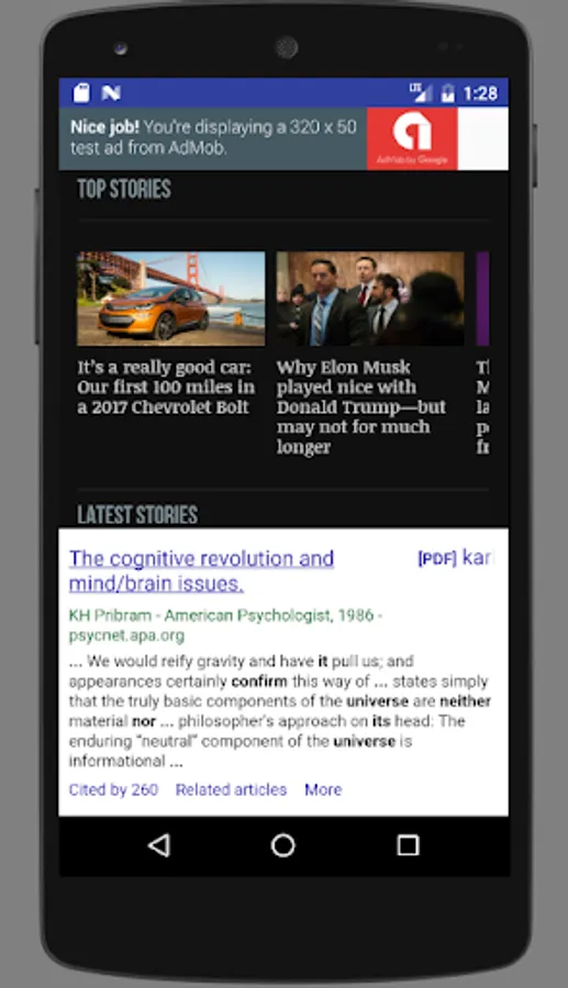 A small ad banner on top followed by the news and then the scholarly articles. You can navigate to the news article that was searched within scholarly articles by scrolling down the top web view to the first article listed under "LATEST STORIES."