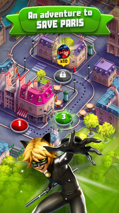 Join Miraculous Ladybug and Cat Noir on a superhero fantasy adventure to free Paris from the clutches of Hawk Moth and Game Master in this epic RPG match 3 game.