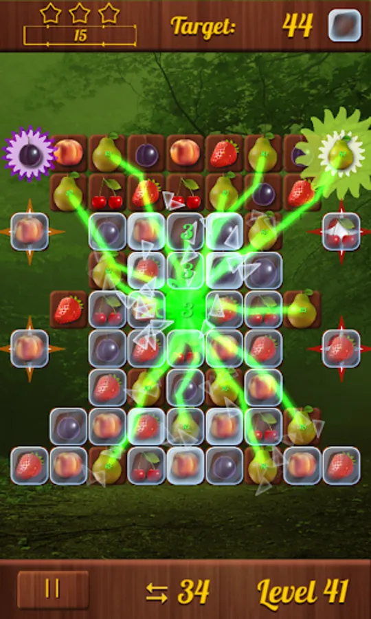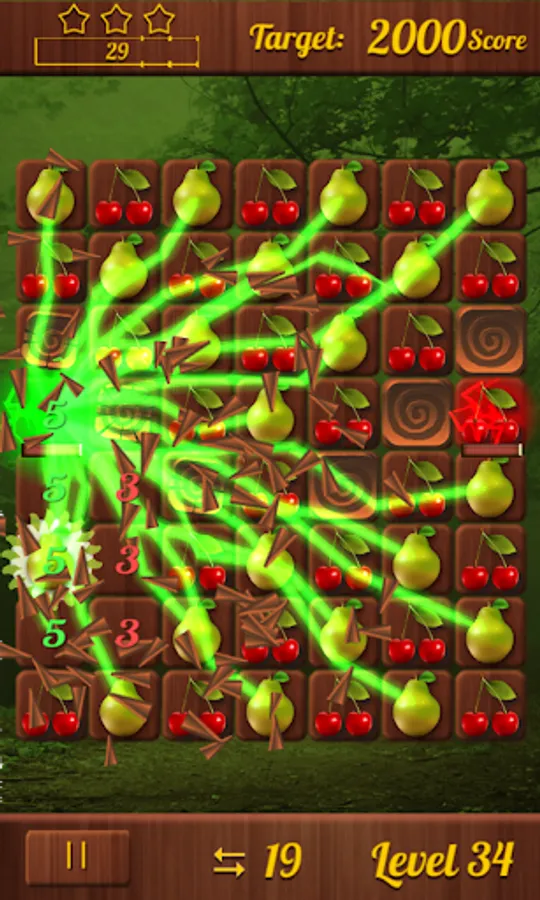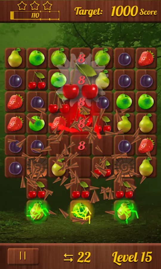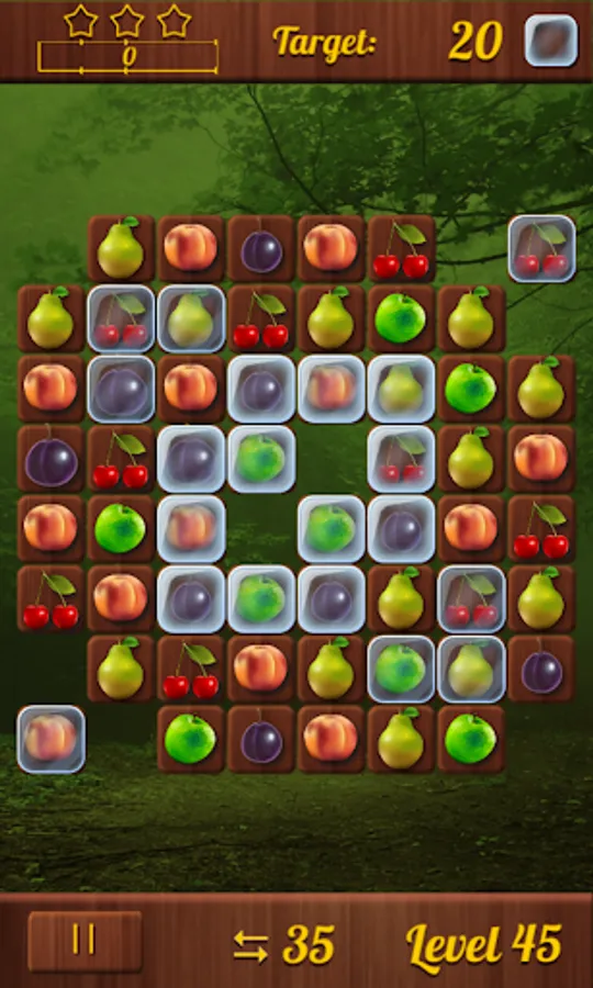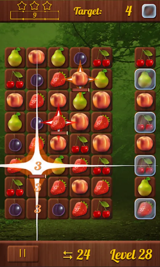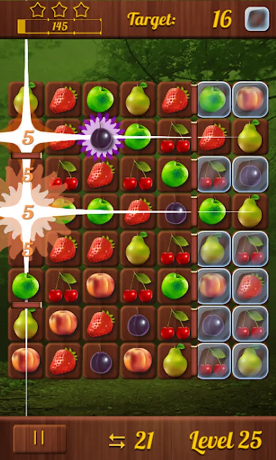 In this game swipe the fruits either horizontally or vertically to match them 3 or more in a line, T-, L-shape. Match 4 or more fruits to get the power-ups. Combine two Power-ups to get the Super Power-ups!