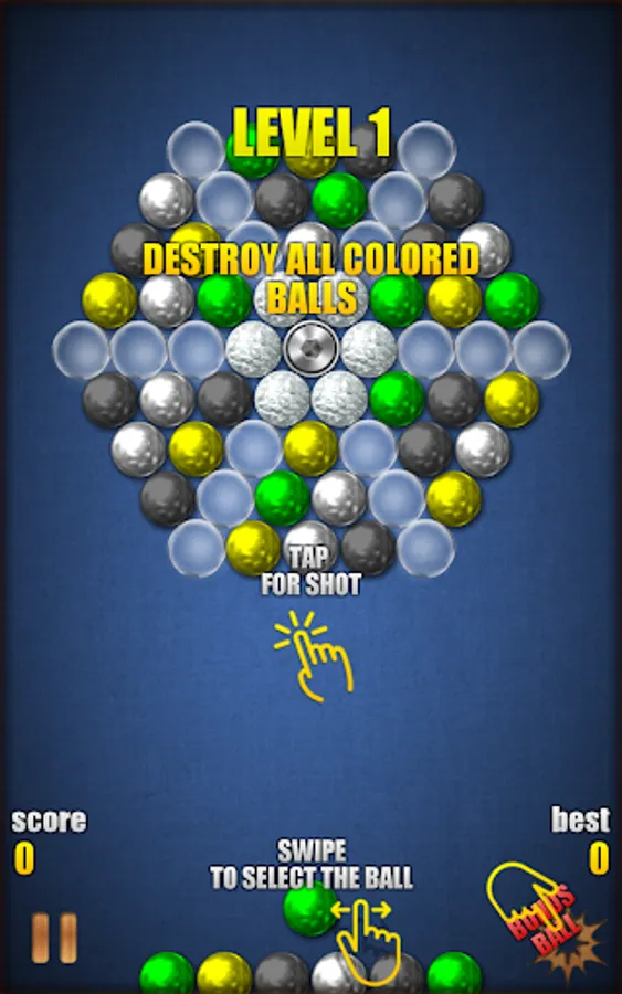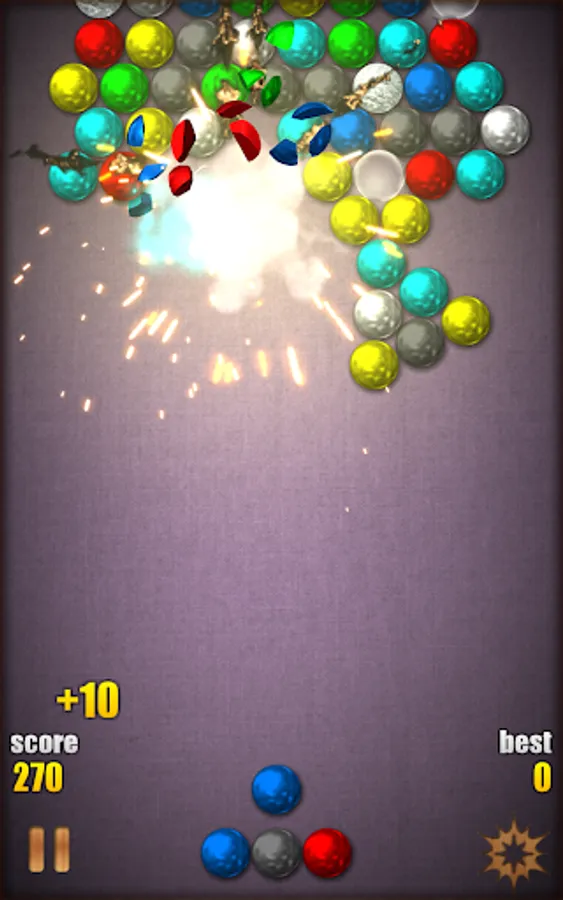 Your goal is to clear all the balls from the board, scoring as many points as possible. How? You shoot at them with more balls, and when three or more of the same color come together, they all explode. Point you finger to where you want the next ball to go. Also you can use the accelerometer to move balls.
