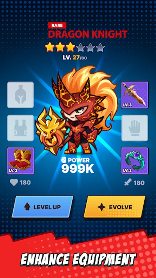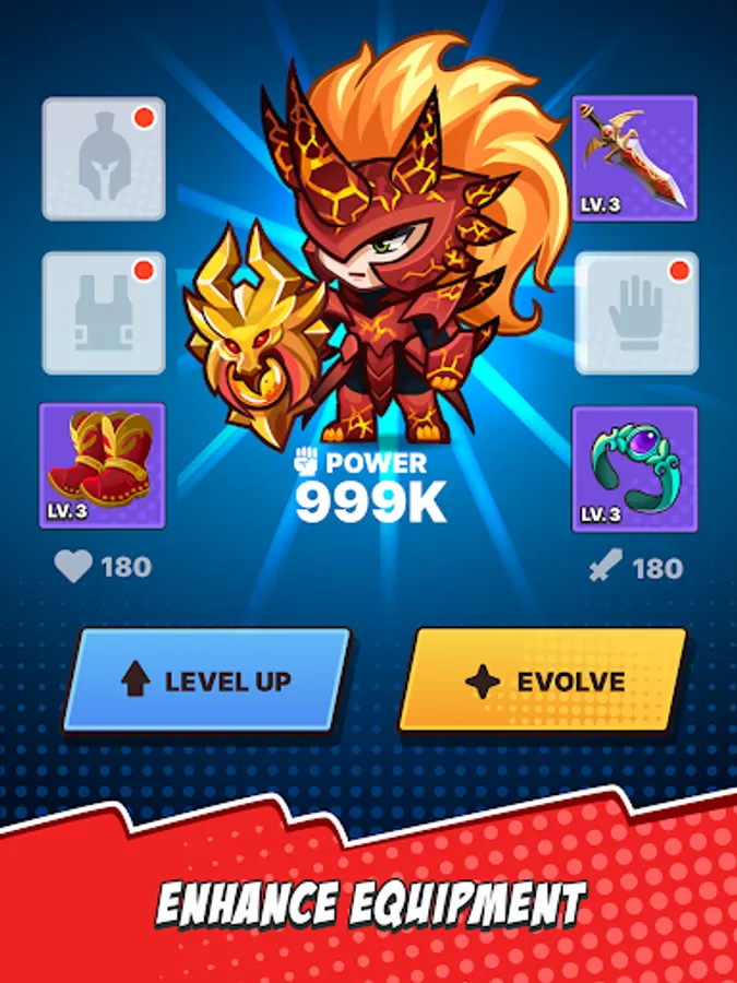 Combine weapons, armor and equipment bonuses. Summon gacha swords, magic staves, body armor, and all sorts of other fun useful items. Equip your Hero and create your very own RPG builds.