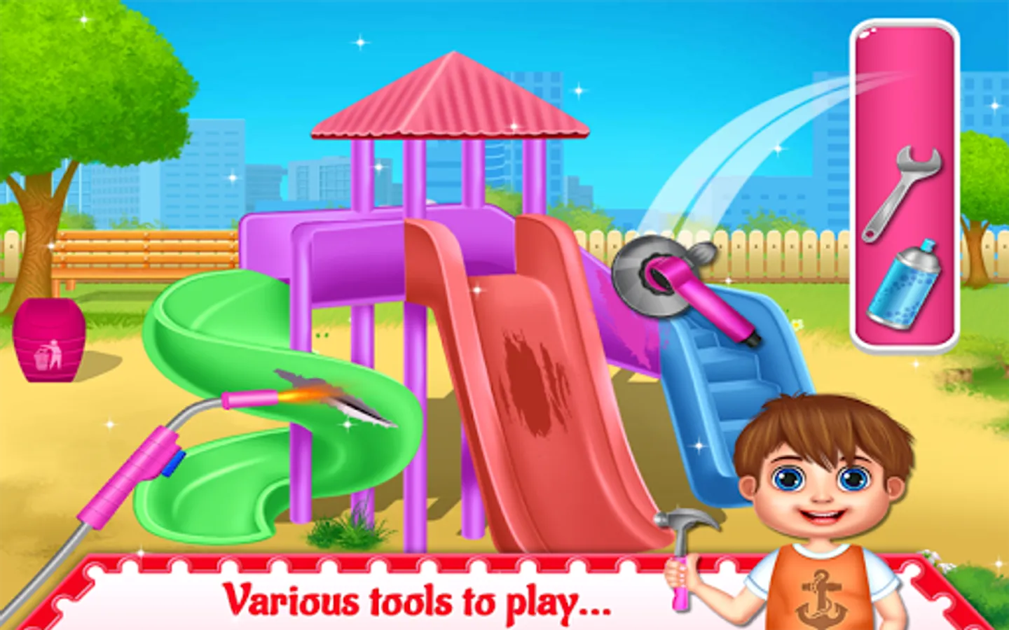 Hello friends, Welcome to the Kids Amusement Park Cleanup and Repair! In this kids theme park game you'll get fun of rides like ferris wheel, kids slider and bouncy spring horse and many more amazing rides. Let's enjoy in the amusement park with all of your friends. But wait! Park is too dirty and all rides needs some fixing before you can use it. So you've to become handyman and repair the rides and clean up the messy park.