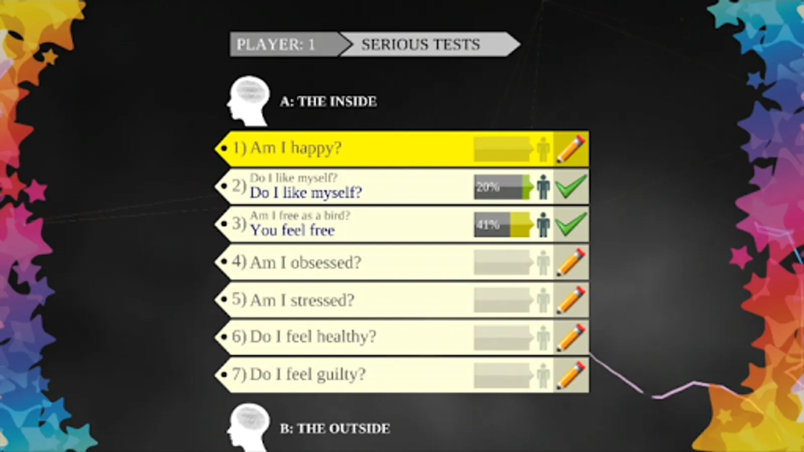 ► THE INSIDE: Am I happy? Do I like myself? Am I free as a bird? Am I obsessed? Am I stressed? Do I feel healthy? Do I feel guilty?