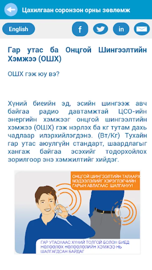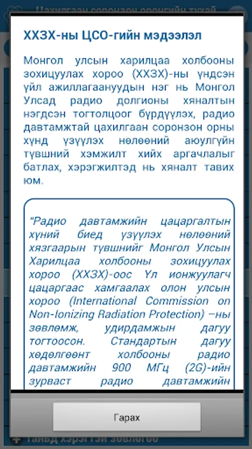 Монгол улсын харилцаа холбооны зохицуулах хороо (ХХЗХ)-ны үндсэн үйл ажиллагаануудын нэг нь Монгол Улсад радио долгионы хяналтын нэгдсэн тогтолцоог бүрдүүлэх, радио давтамжтай цахилгаан соронзон орны хүнд үзүүлэх нөлөөний аюулгүйн түвшний хэмжилт хийх аргачлалыг батлах, хэрэгжилтэд нь хяналт тавих юм.
