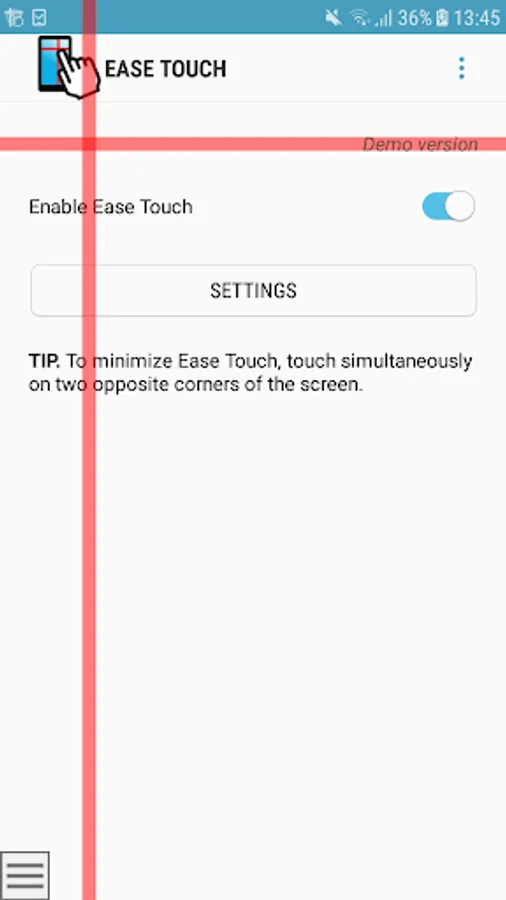With Ease Touch you could perform –by using just one finger– all those actions that allow you to control the mobile device. It captures all touches on the screen, distinguish voluntary touches from non-voluntary ones, and allows you to perform most standard gestures (e.g. tap, double tap, drag, swipe, pinch, etc.).