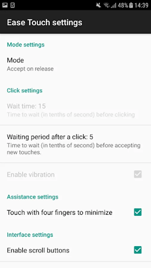 – Hold to accept mode. To perform an action, you must keep touching the screen until the countdown expires. If you move the finger or release it, the countdown is canceled.