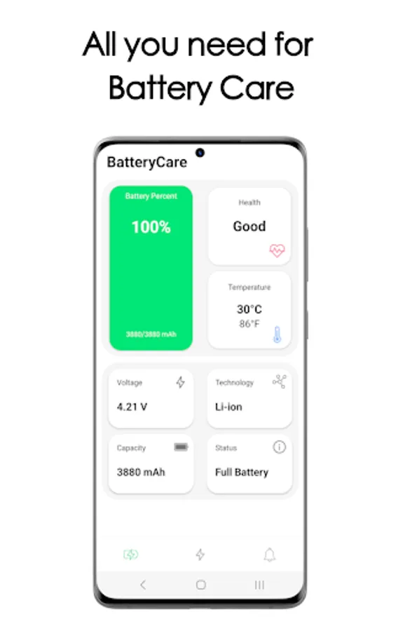 BatteryCare is an app that helps you to know about your battery phone, showing real time information, status, voltage, health, temperature, capacity and many things more.